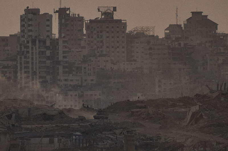△当地时间10月14日,从以色列南部边境地区望向加沙地带,一辆以色列坦克在加沙地带某区域内行进。