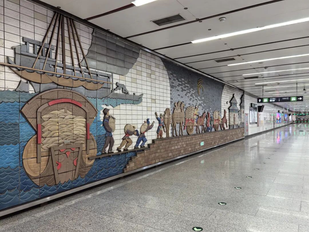 地铁朝阳门站连接着6号线与2号线,人来人往的换乘口旁,一面彩砖壁画总能让行人驻足。壁画上,工人正用骆驼和马车从码头往粮仓搬运粮食,这里藏着朝阳门的百年文脉:明清时期,朝阳门是进京粮道的重要关口,“朝阳门运粮”的场景,曾是老北京记忆里鲜活的市井画面。如今,这幅壁画成了连接过去与现在的纽带,让每一位途经者都能短暂触摸这座城市的历史肌理。