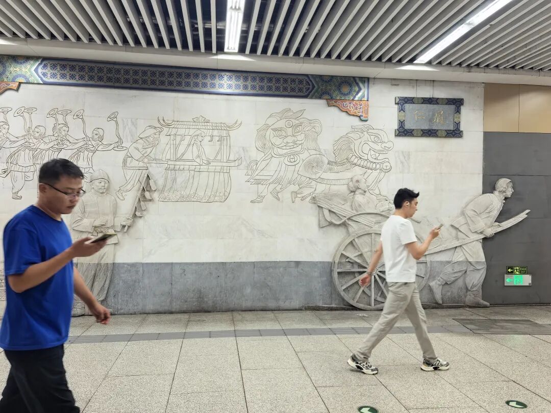 地铁东四站的站厅里,有一幅特别的壁画——《东四记忆》。没有鲜艳的色彩,只用简洁的线条勾勒出老北京的市井日常:点炮仗的孩童、卖糖葫芦的摊主、正在拉车的车夫……每一个场景都戳中老一辈人的回忆。
