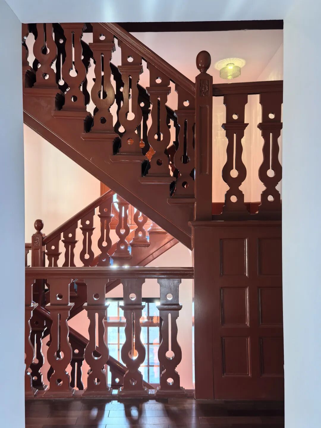 在这里,随手一拍都是电影感大片。午后的阳光透过洋楼的窗格,在红色木质楼梯上投下一片光影,每一步踩上去,都像踏在时光的刻度里。楼梯上方的复古顶灯,在白色墙面上映射出美丽的花纹,竟像一幅天然的印象派画作。有人举着相机将这帧“电影感画面”定格下来。