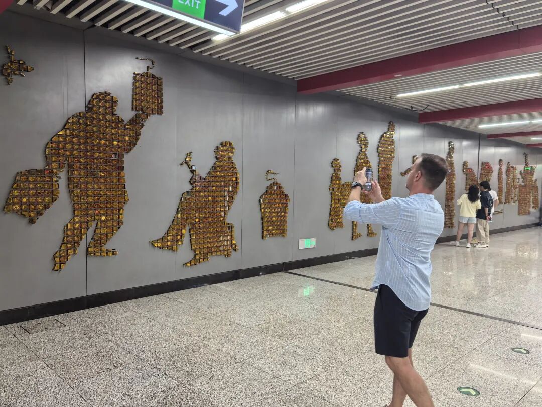 地铁列车驶入南锣鼓巷站,下车的人多了起来,大家都朝着一个方向走——南锣鼓巷主街。有的游客会被站厅内的一面琉璃壁画吸引,停下脚步驻足观看,墙面上的琉璃中镶嵌着北京生活老物件,拼贴成老北京典型的人物形象剪影,将老北京的记忆通过艺术形式展现与留存下来。一位游客惊喜地向同伴说:“这里有粮票、黑白照片,还有北京第十一届亚洲运动会的吉祥物邮票,都是我小时候见过的。”