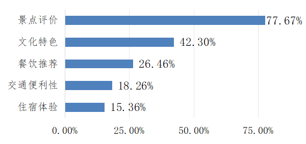 “景点评价”表现为景点体验质量反馈、“文化特色”表现为景点历史价值和艺术表现探讨、“餐饮推荐”表现为美食类型和用餐场景内容,这三类信息对于旅游目的地口碑有重要影响,有必要重点关注。
