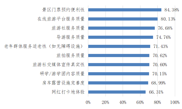 此外,网红打卡地/新兴业态体验未达预期,近年来的网红经济热度有所降温,消费者对网红打卡地体验、房车露营设施完善度的满意率均低于70%,分别为66.31%、68.99%;网络口碑大数据调查表明存在过度商业化、环境脏乱、排队过长、设施损坏、实物与宣传差距大等问题。此外,研学/旅拍等专项服务待提升,研学游学和旅拍服务满意率在70%左右,服务评价表现一般,网络口碑大数据调查表明研学游学主要存在机构资质混乱、缺乏服务标准、组织无序、安全隐患大等问题;旅拍服务主要存在水平不达标、隐形收费、管理混乱、服装卫生差、售后无响应等问题。因此,新兴旅游消费场景还需要企业深化内功,进一步提升供给侧服务能力。