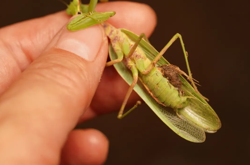 铁线虫离开以后,螳螂并没有很快死去,但它的行动肉眼可见地缓慢,我把它翻过来,发现铁线虫这一次甚至不是从排泄孔里出来的,而是直接突破了螳螂的肚子……那天直到我们离开,其实那只螳螂都还活着,也能爬,但这样一种状态在自然环境下,结局也是显而易见吧。