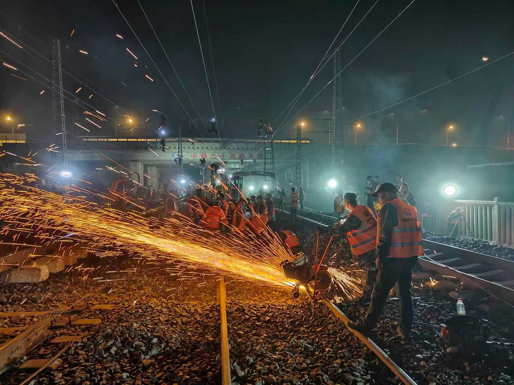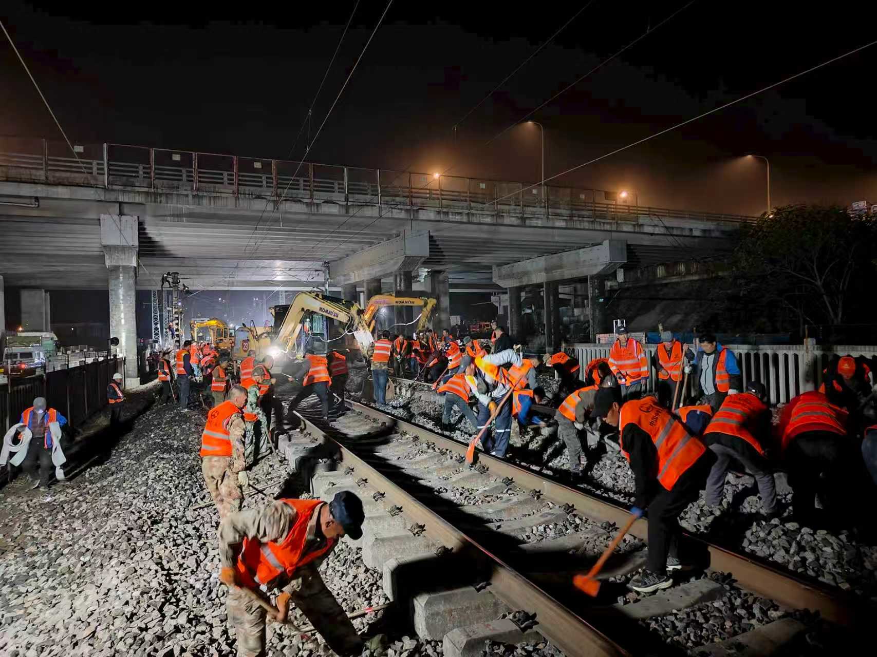 本次便线回拨施工涉及京广铁路双线1.21公里,最大拨距3.4米。千名作业人员高效完成线路回拨及配套设备调试,攻克了时间紧、场地受限等诸多难题,保障了施工在240分钟规定时间内按时完成,未影响后续列车正常运行。