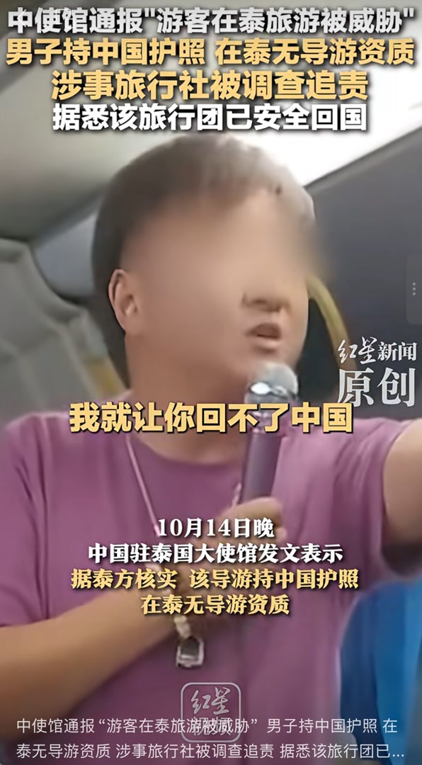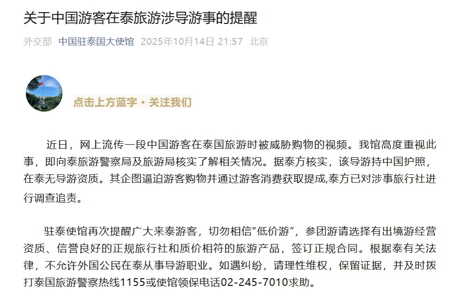 中国驻泰国大使馆高度重视此事,并于10月14日发布通报:据泰方核实,该导游持中国护照,在泰无导游资质,企图逼迫游客购物并通过游客消费获取提成。目前,泰国警方已逮捕涉事导游,对涉事旅行社调查追责,其中两名负责人也因非法从事导游行业工作被捕。