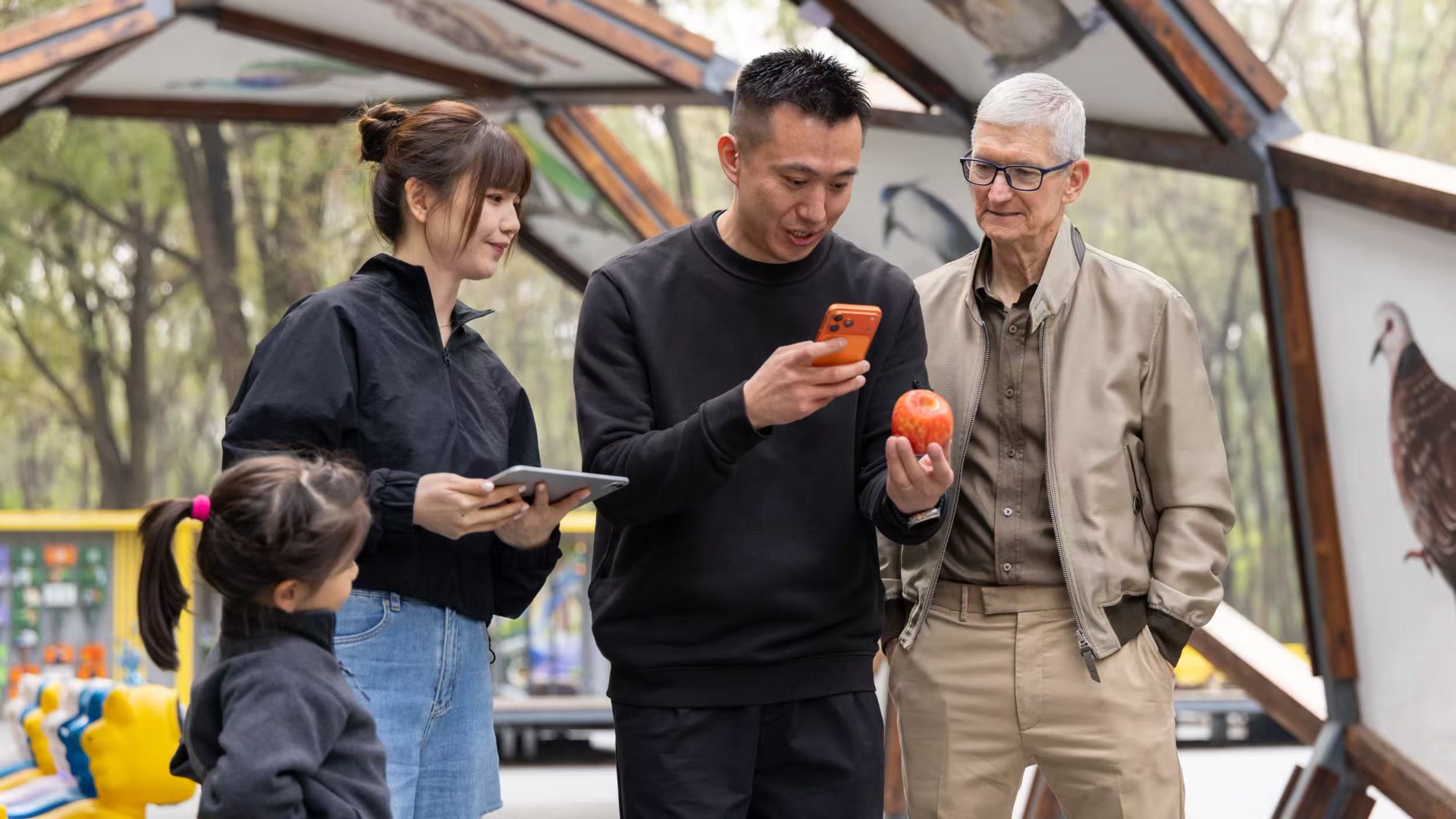 10月15日上午,苹果公司首席执行官蒂姆·库克来到将府公园,在一处回廊前停下脚步。与他同行的开发者Ace举起手机,对着一颗由小女孩递过来的苹果按下快门,随后,手机里传出一个清晰的中文读音——“苹果”,库克也跟着手机里的发音说出:“píng guǒ”。