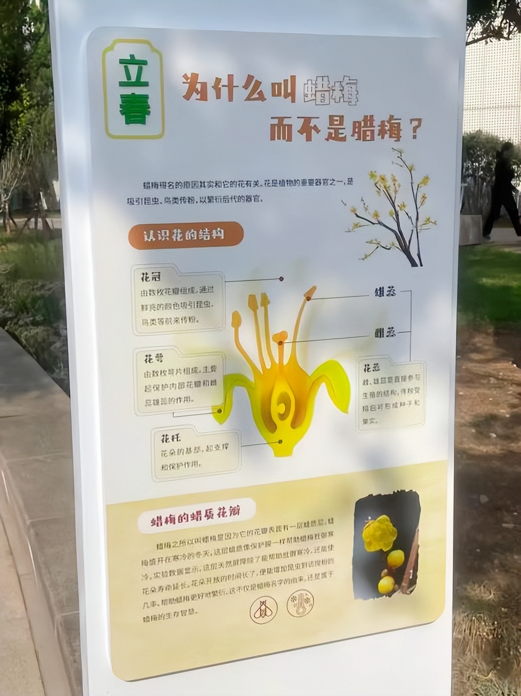在这里,植物的根、茎、叶、花、果实、种子不再是书本上孤立的图片,而是触手可及的生命实体。“为什么叫‘蜡梅’而不是‘腊梅’?”“立春”节气点的一块展板吸引了大家的目光。展板解释了蜡梅得名是因花瓣表面覆盖着一层蜡质,同时清晰展示了花的结构。