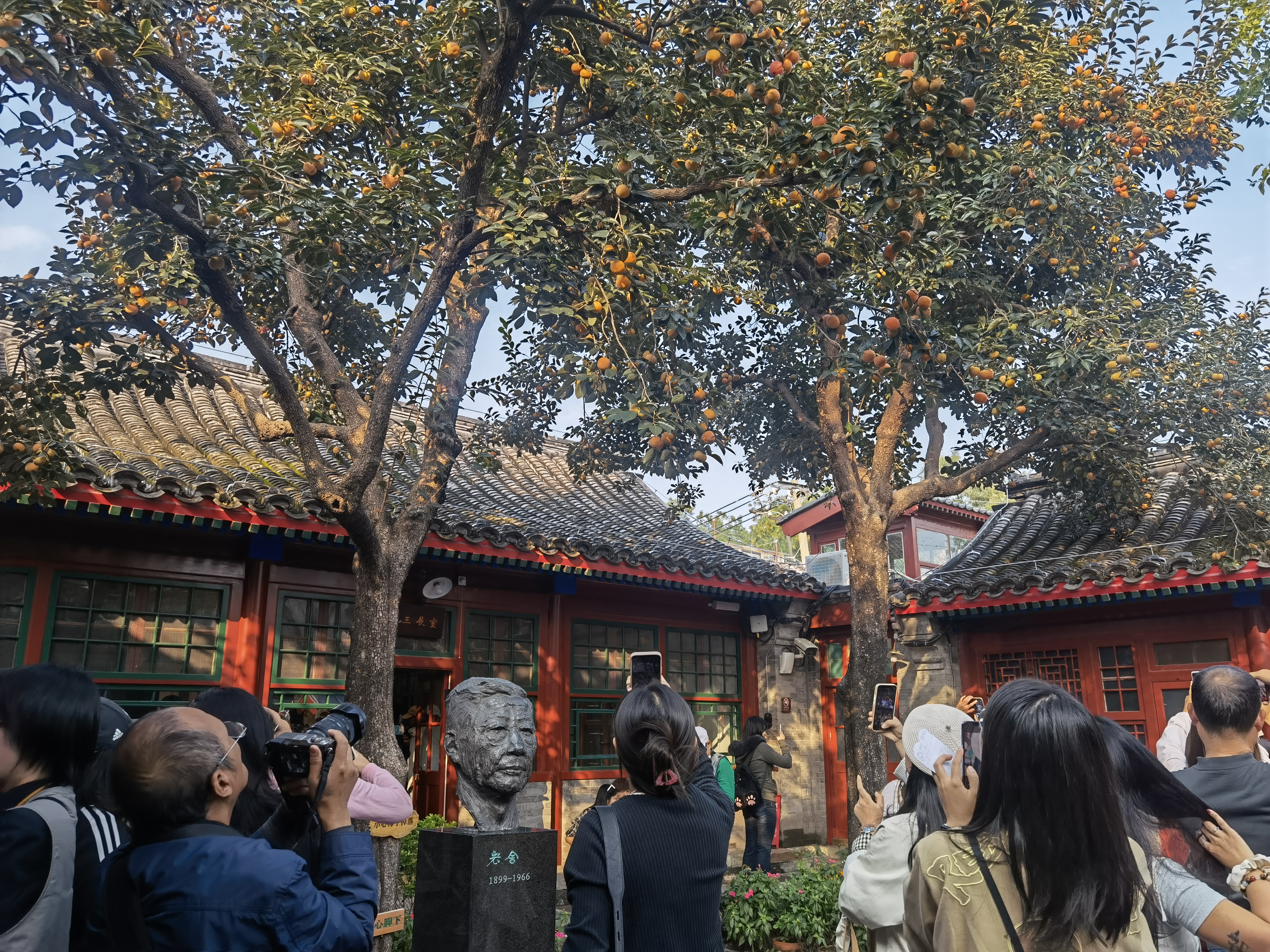 不少人举着手机、相机,寻找最佳角度拍摄柿树,还有人在老舍雕像前合影留念。虽然游客众多,但现场秩序有条不紊。除了柿树,纪念馆的三个展室内,以生动翔实的影像、实物资料和声光互动技术,展示了老舍先生的生平,也吸引了不少游客。