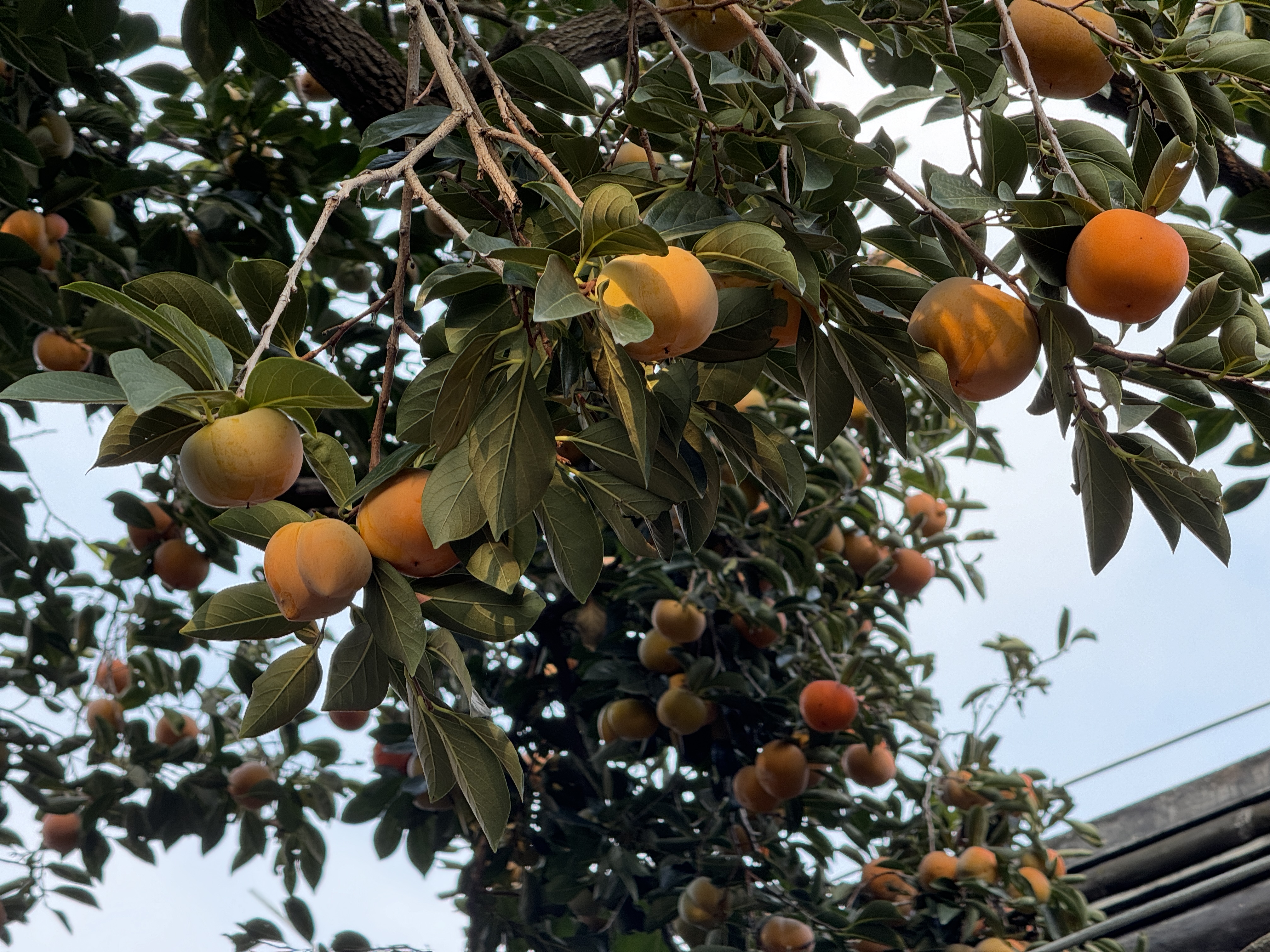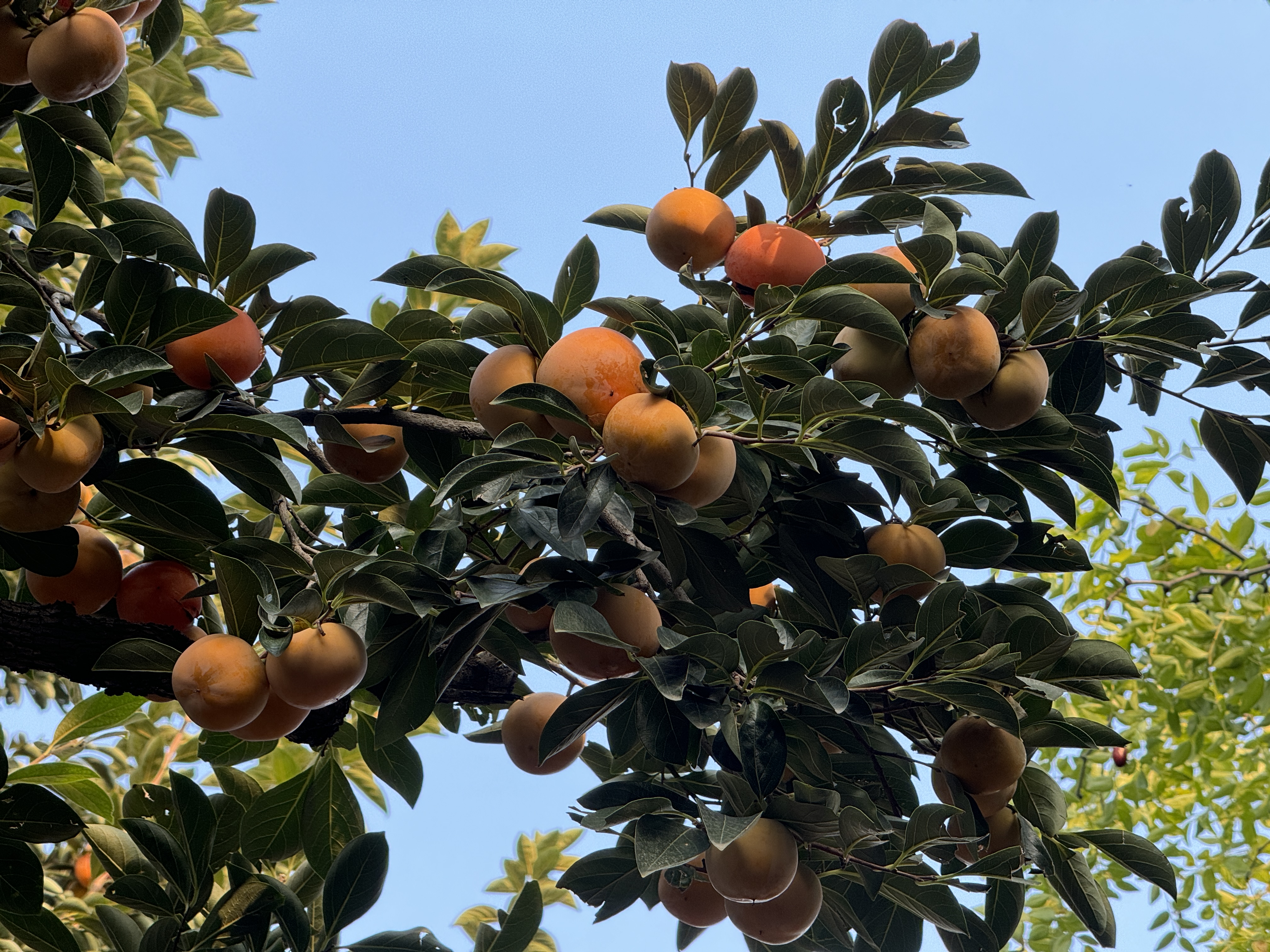 目前院内两棵柿树的果实成熟率约有60%左右,有的柿子还是隐在绿叶间的青果,有的则已熟成半透明的橘红,金黄、橘红或青绿的柿子如一盏盏小灯笼挂满枝头,色彩丰富又颇具秋韵。镜头拉近可以看到,每颗柿子都裹着薄薄的白霜,部分红彤彤的柿子在阳光下仿佛能看见里面果肉流动的光泽。