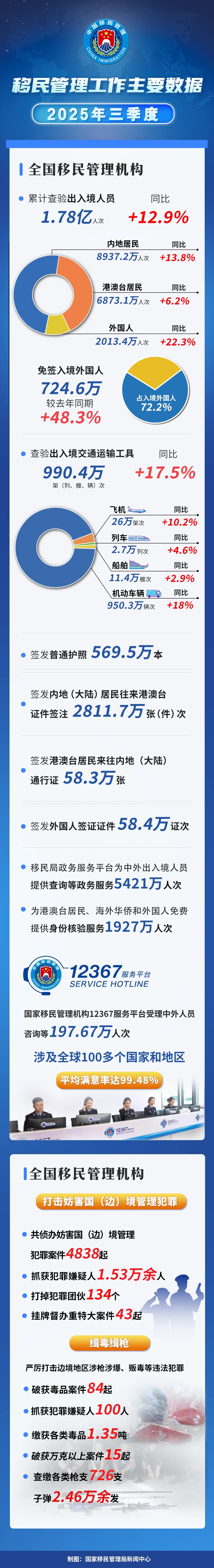 今年第三季度,共签发普通护照569.5万本、内地(大陆)居民往来港澳台证件签注2811.7万张(件)次,签发港澳台居民来往内地(大陆)通行证58.3万张;签发外国人签证证件58.4万证次。移民局政务服务平台为中外出入境人员提供查询等政务服务5421万人次,为港澳台居民、海外华侨和外国人免费提供身份核验服务1927万人次;国家移民管理机构12367服务平台受理中外人员咨询等197.67万人次,涉及全球100多个国家和地区,平均满意率达99.48%。