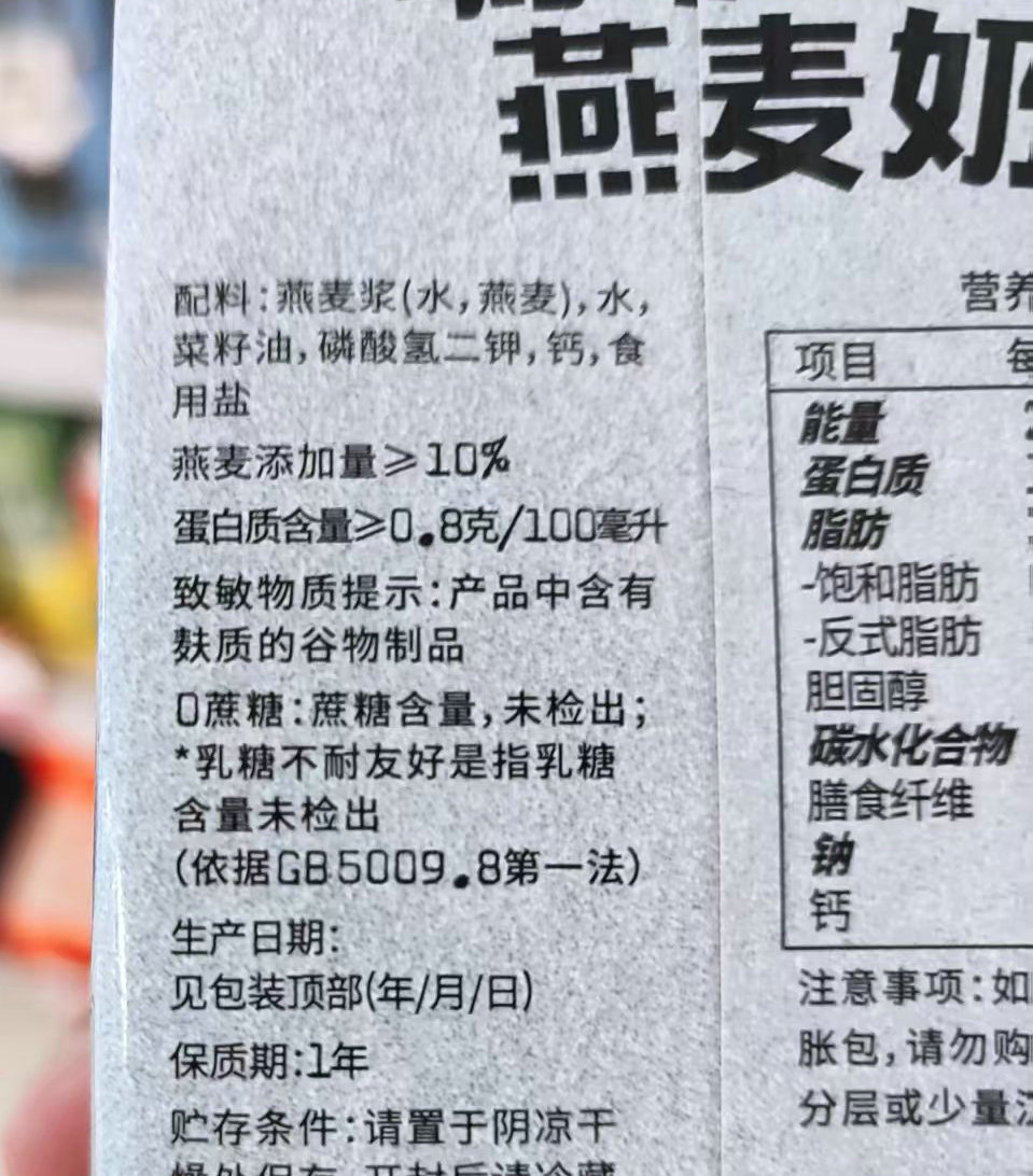 还有一款燕麦奶宣传“乳糖不耐友好”,但小字解释为:乳糖含量未检出。原来,这款燕麦奶不含动物乳汁,属于植物蛋白饮料。