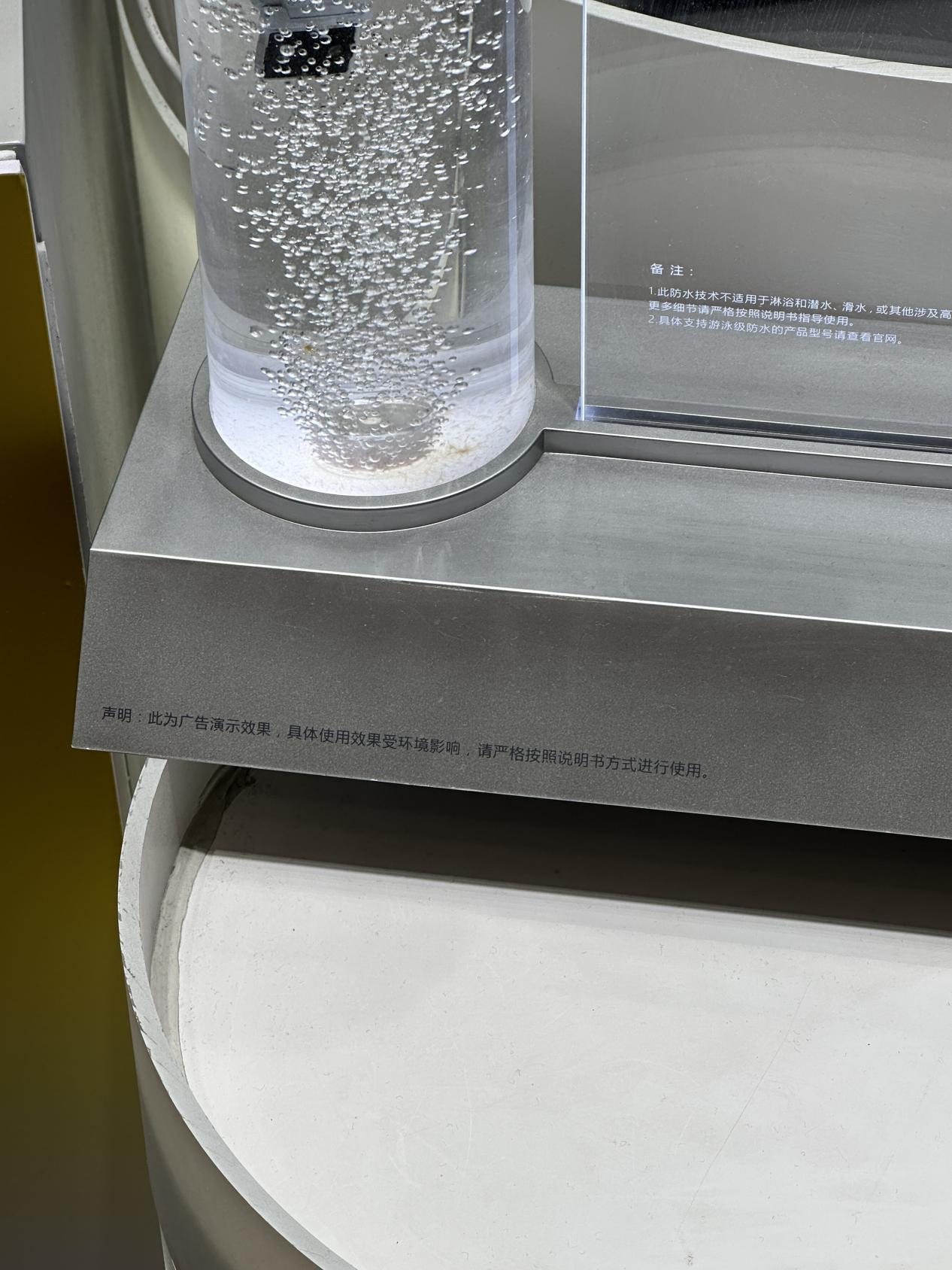 一款儿童电话手表,大字宣传着“游泳级防水”“能戴着游泳的电话手表”,而且在宣传牌旁,一只手表就放在有水的容器内,让人感觉防水效果很好。但其宣传牌下小字却写着:此防水技术不适用于淋浴和潜水、滑水,或其他涉及高速水流、或浸没在浅水区以下的活动,且防水性能并非永久状态。而且,旁边手表浸在水里的演示,还用小字备注着:此为广告效果,具体使用效果受环境影响,请严格按照说明书方式进行使用。