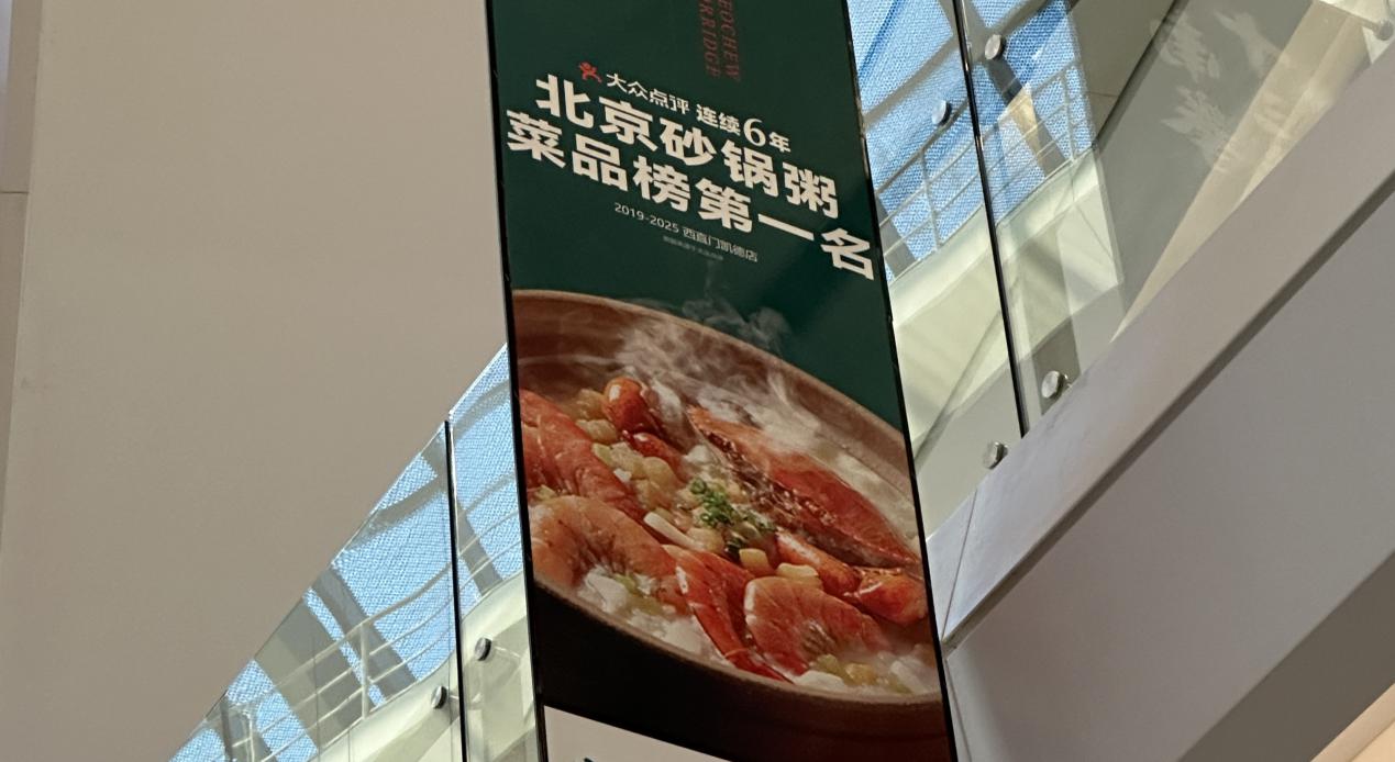 一家商场中庭悬挂着的广告海报上,专卖砂锅粥的商家用加粗大号字体宣传着“某点评连续6年北京砂锅粥菜品榜第一名”。但其下的一行小字却解释此“第一名”是指同品牌在另外一家商场的门店,而非此家门店。这样的一行小字,在大幅的海报上,实在很难被看到。