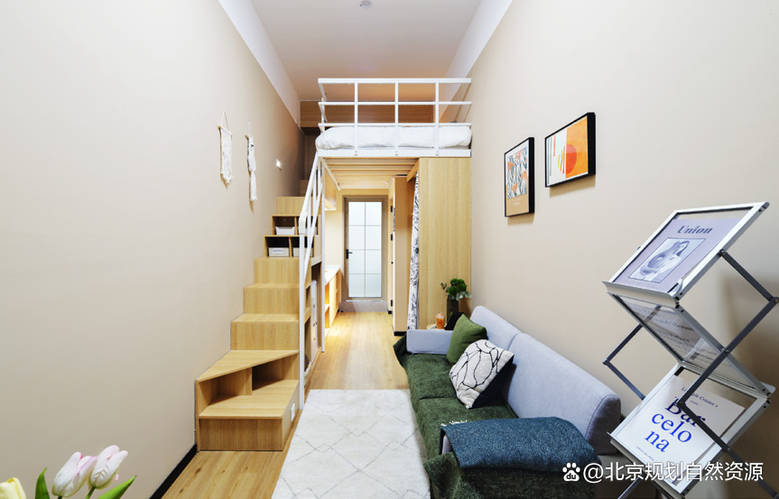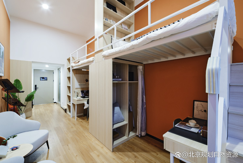 项目在规划上不仅实现了居住功能,还通过科学的功能重组与空间活化,成功融合了社交、健身、阅读、共享等多元化的社区功能,构建了充满活力的租赁社区。公寓的户型设计精美,提供包括优享平层、轻享双人间等多种主题的户型。设计充分利用了原工业厂房4.2米的层高优势,创新规划了179间“臻享跃层”户型。通过提升空间的竖向利用率,实现了小户型的空间高效转化,精准满足了社会单身青年、情侣及小家庭等不同客群的多元化居住的需求,并且极具针对性地服务于金融街、阜成门商圈的市民与青年人。整体设计不仅注重功能复合与空间体验,更体现出对当代城市生活需求的深入洞察与回应。