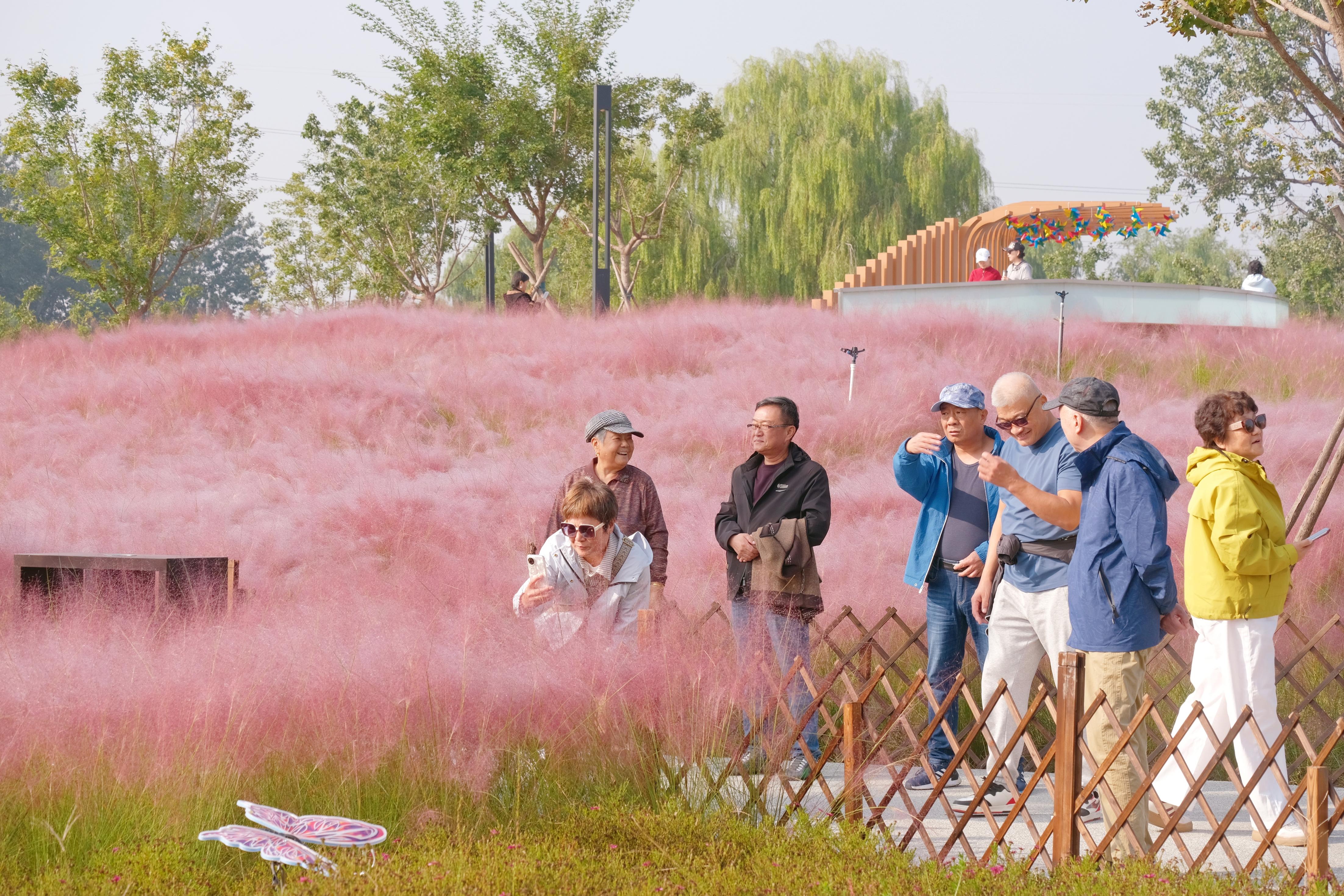 本月13日新开放的京城紫岸公园,占地 685 亩,是平房地区新晋生态地标。1.4 万平方米的粉黛乱子草在10月迎来盛期,如烟如霞的粉色花海随风起伏。摄影师从高角度拍摄,让粉色的花穗铺满画面,人物仿佛置身“粉色云海”。园内的山桃草、蒲公英与蒲苇,构成高低错落花境,与远处的彩叶树木相映成趣。逛累了,还可以在风车走廊休憩。孩子们在全龄友好区的沙坑与滑梯间嬉戏,居民们在滑板广场或跑道上尽情挥洒活力。