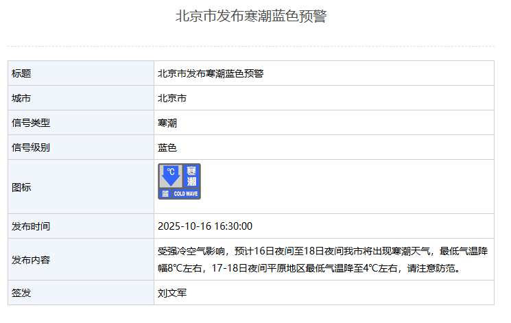 北京发布寒潮蓝色预警:夜间平原地区最低气温将降至4℃左右