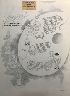 早在展览开幕前,《时尚》杂志于1935年10月30日用一整版的篇幅梳理预测了伦敦艺展可能带来的影响,尤其是中国佛像的衣纹装饰和陶瓷的花纹色彩:现在,《时尚》正在预测中国的影响力。因为服装设计师已经从布料角度思考中国佛像,丝绸商人也正在将他们的调色板与早期中国陶器和绘画中罕见的柔和色相匹配……这里的两组早期陶器,让我们的眼睛看到了美妙的色彩突变(以前在英国从未见过),它们介于灰色和青瓷绿色之间,介于蜂蜜色和暖棕色之间,以及所有的白色色调。第三组是18世纪的明代瓷器,则展示了更熟悉的形状,更明亮的颜色,紫红色、珊瑚红和鳄鱼紫。