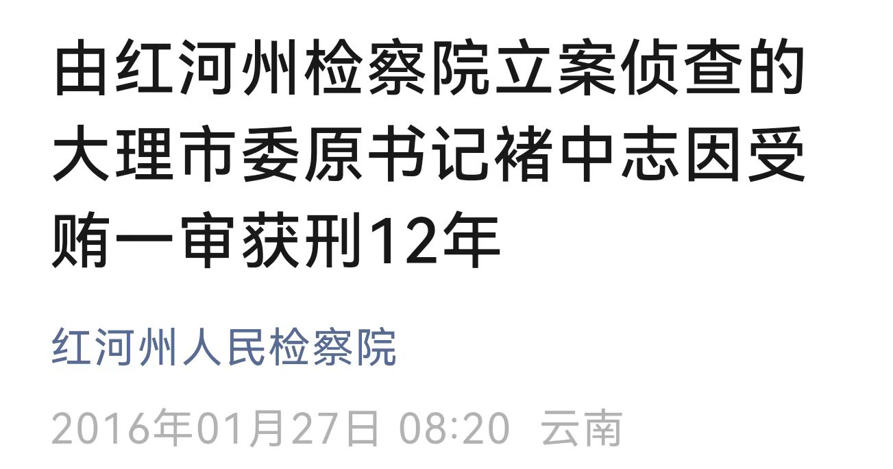 2016年1月,红河州中级人民法院一审依法公开对大理州原州委常委、大理市委书记褚中志受贿一案进行公开宣判,认定褚中志犯受贿罪,判处有期徒刑12年,并处没收个人财产人民币50万元;依法予以没收案发后褚中志退缴的受贿款。