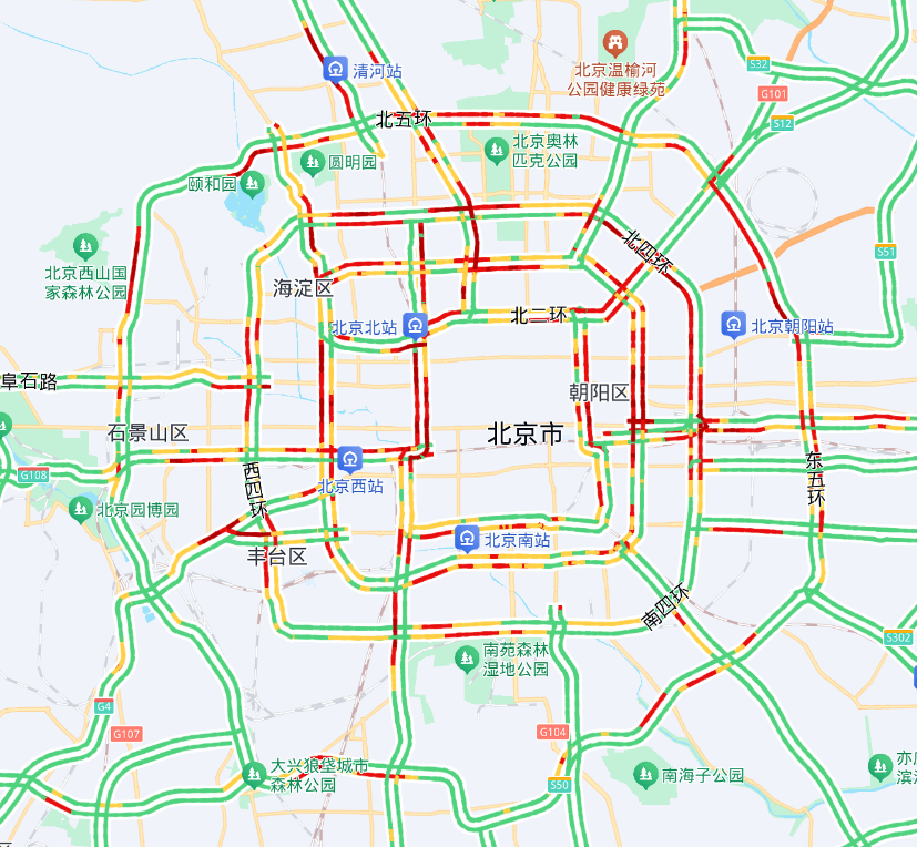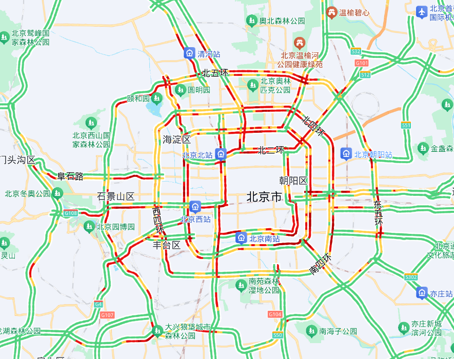 晚高峰期间,通勤、休闲、聚会出行叠加,城区东西部环路北向南、北部环路东向西部分路段,万泉河路、西直门北大街、丰体南路等联络线出城方向部分路段,京藏、京开、京港澳、京通快速等高速公路出京方向部分路段车流量大。
