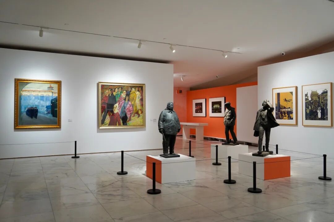 一代代从央美走出的艺术家频频走进首都发展建设的现场,创作了大量展现时代精神与文化理想的佳作。中央美术学院美术馆的收藏成为研究北京城市形象演变的重要视觉文献库。此次展览聚焦中国现当代美术史中北京城市形象的艺术叙事,系统梳理了中央美术学院美术馆所藏的北京题材艺术作品,类型包括油画、国画、版画、雕塑、摄影和影像。谢岩油画《清晨紫禁城》、谭权书版画《天安门》、瞿广慈雕塑《王府井》、喻红《川》、高帆摄影作品《参加庆祝活动的北平民众在天安门华表下》等都是这次展览的重点作品。