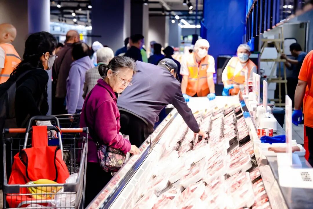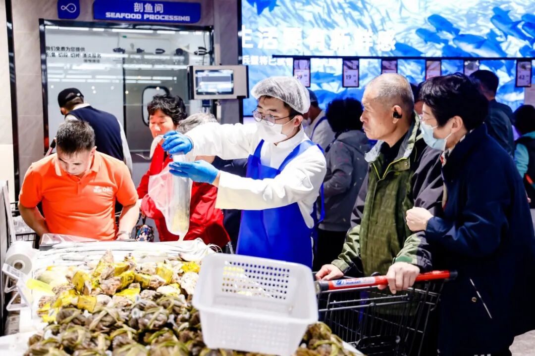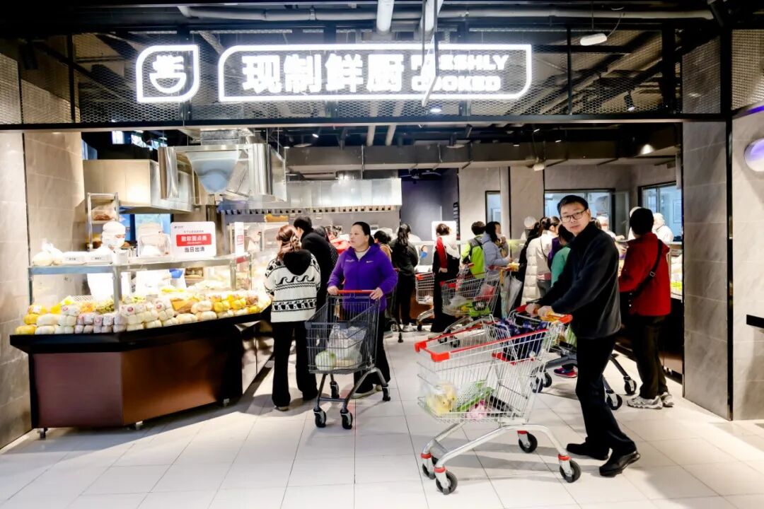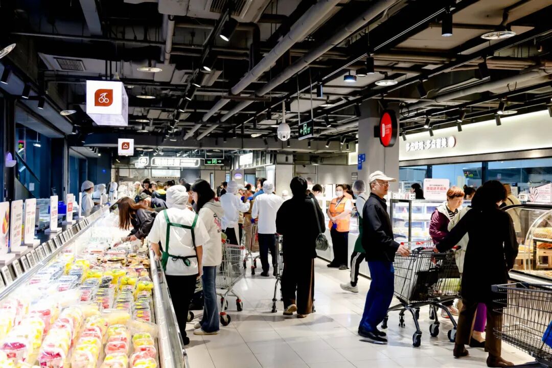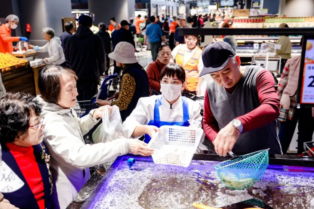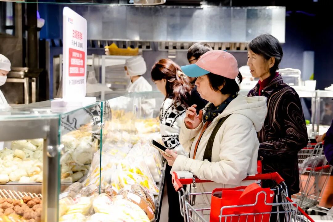 记者现场看到,熟食和烘焙区的多个明厨档口前人头攒动,熟食区现烤的北京烤鸭滴着油汁,肉蛋堡、香河肉饼、卤猪蹄等多款暖身菜品,核桃满满面包和蔓越莓吐司等特色现制烘焙提供免费试吃,吸引大批居民品尝选购,为门店周边顾客提供“一站式”秋季三餐解决方案。
