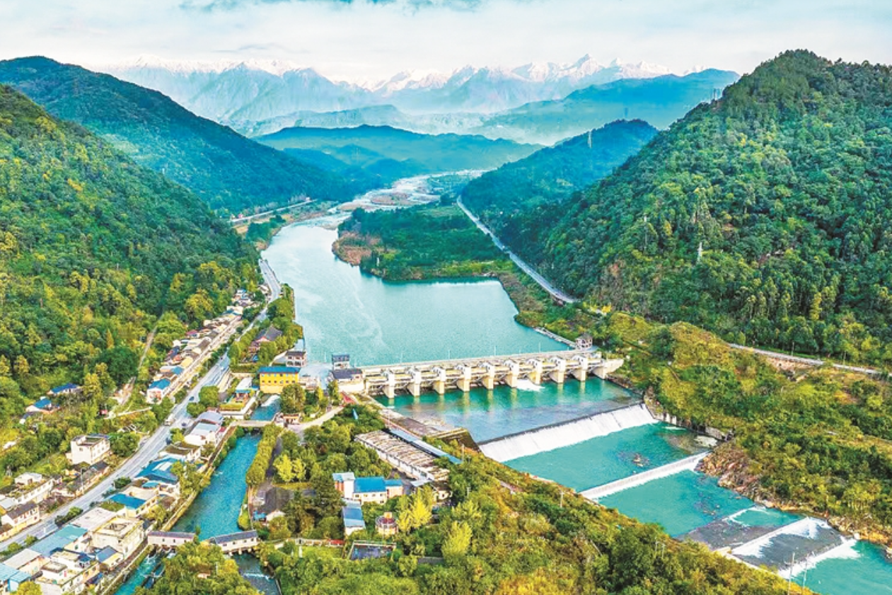 湔江堰利用西北高东南低的地理特征,采用“平梁分水”的技术方法,呈扇形状分出濛阳河、马牧河、新润河等9条河流,形成“湔水九分”的独特水系格局,各分水河流按既定通道畅流灌溉的同时,又对下游浅层地下水进行补充,形成了地表水与地下水“双水源互济”的灌溉工程体系。图为湔江堰渠首枢纽工程。张勇 摄