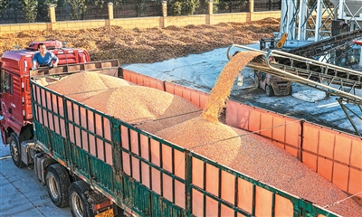 正值秋粮收获关键期,山东省乐陵市积极组织协调各粮食收储企业,充分利用现代化烘干设备和智能化储粮技术,开足马力抢烘抢储,全力保障秋粮颗粒归仓、安全存储。图为工作人员将烘干的玉米装车收储。贾鹏摄(人民视觉)