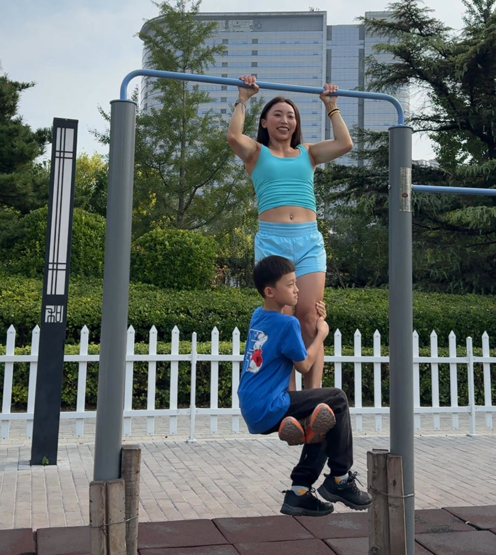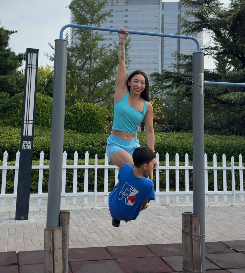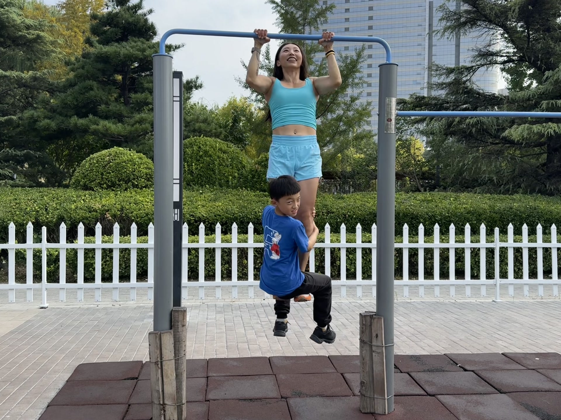 在通州区漫春园的市民健身区,单杠旁围满了人。人群中央,一名女子手臂肌肉线条分明,只见她双手紧握单杠,将双脚勾起,她11岁的儿子熟练地坐上她的脚背,双手抱紧她的双腿,女子随即臂膀发力做起了引体向上。尽管脚上有个约60斤重的男孩儿,可她的下颌仍轻松过杠,再缓缓下落。一连三次,标准的负重引体向上轻松完成。她脸上始终挂着从容的笑意,周围响起一片赞叹与掌声。