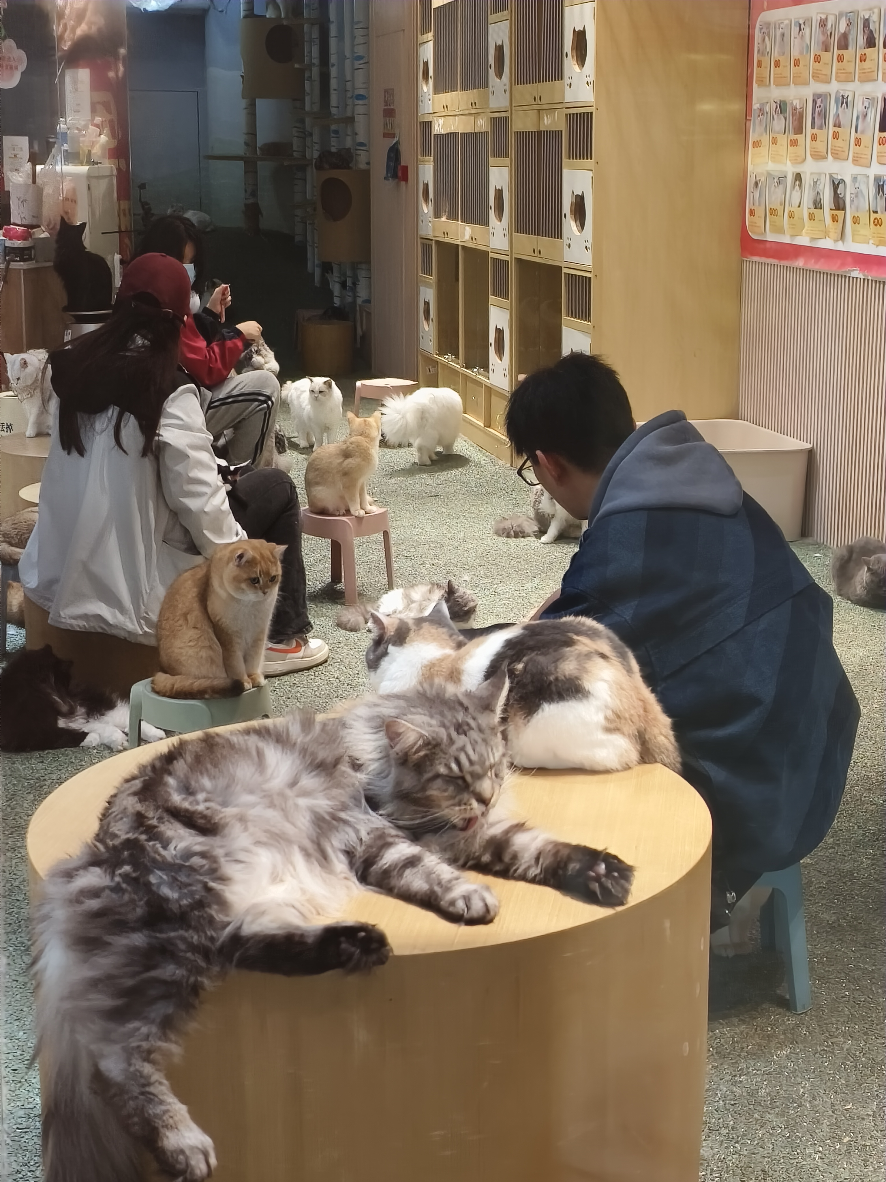 在五棵松商圈一家人气颇高的猫咖内,几名顾客正在惬意地撸猫,墙上贴着几十只猫咪的图片和介绍、撸猫说明以及“喵星人肢体语言”介绍。收款台和撸猫区的门上贴着告示,所有猫均接种过猫三联、狂犬疫苗,但记者未见到公示检疫证明。工作人员明确告诉记者,猫都打完了疫苗才放进去,不会拿顾客的生命开玩笑。