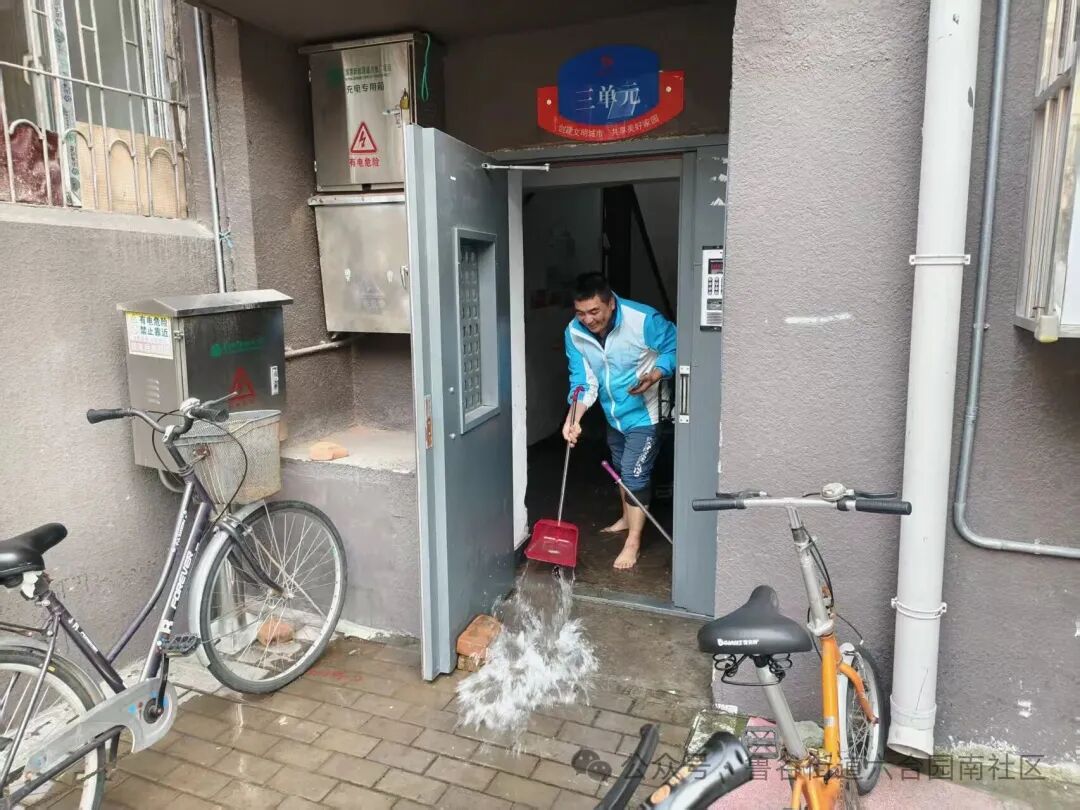 18号楼包楼社工李英杰接到该居民求助后,第一时间赶到现场。他一边帮助居民联系供暖公司,一边将居民家中的跑水扫到楼外,最大程度减少了积水对居民家和邻里的影响。