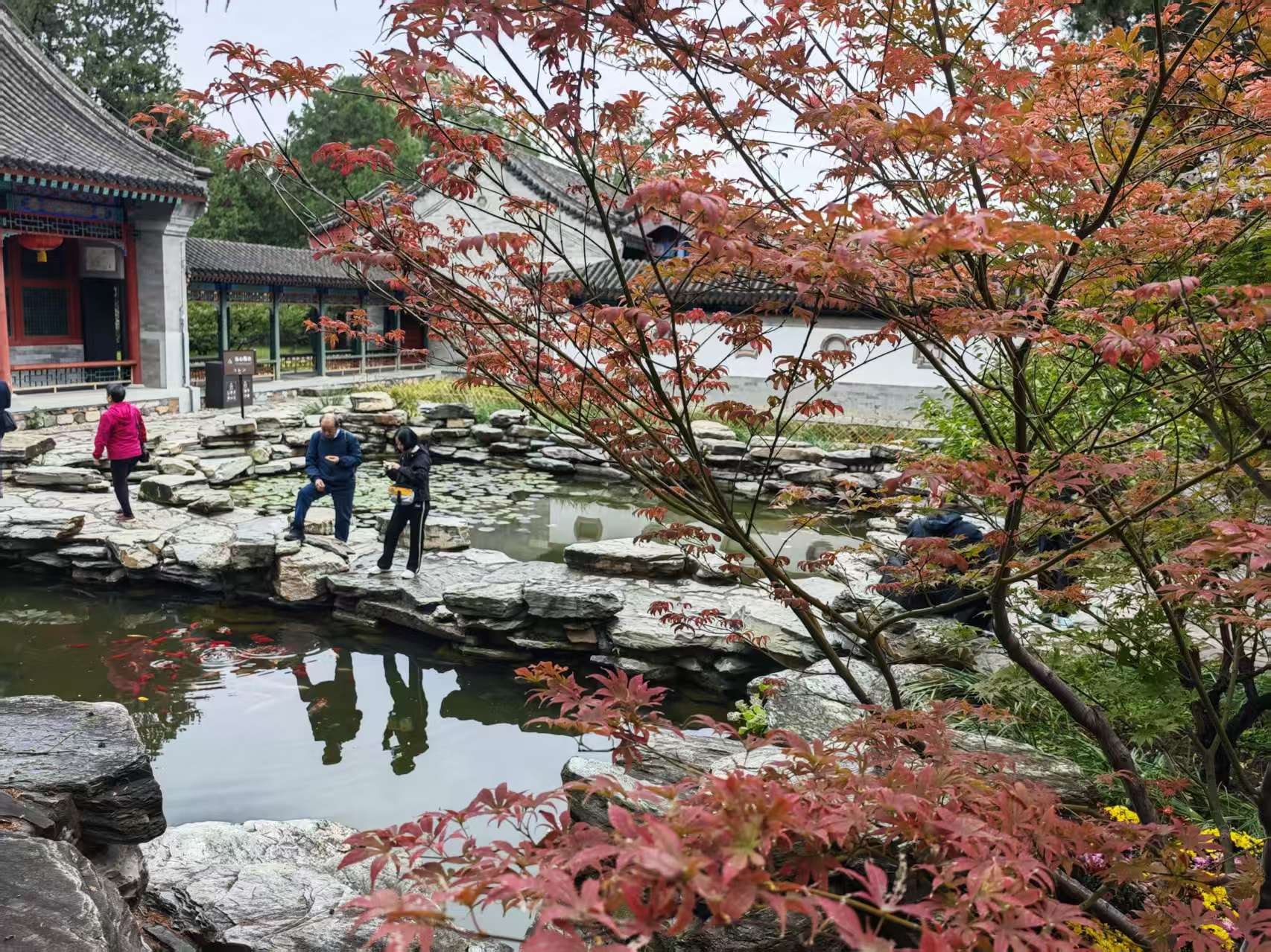 这些观赏点与三条主题路线相互呼应,贯穿遍布香山南北各游览路线,覆盖高、中、低不同海拔区域,最佳观赏时间也各不相同。“枫林村”是无需跋涉的秋日私藏,渐红的枫叶与金黄的银杏在此交织,营造出静谧而浓郁的秋日氛围;而在“看云起”登亭远眺,则有豁然开朗之感,云霞、古寺与漫山彩林共同演绎出香山秋日的磅礴诗意。其中包括碧云寺、山杏林等经典“打卡地”,也新增了静翠湖“湖山相映”的自然景观,满足不同游客的赏景偏好。在点位选择上,公园特别注重彩叶树种多样性以及与景观建筑的融合效果。18处点位中有10处位于建筑周边,游客既可置身景中,感受人文与自然的和谐交融,也可远眺借景,欣赏层次丰富的秋日画卷。