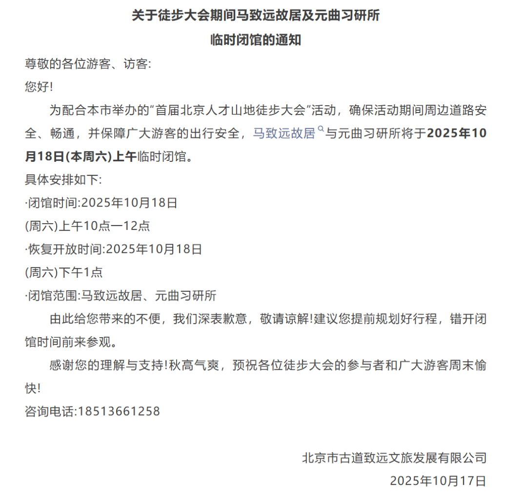 另据魅力王平微信公众号消息,马致远故居与元曲习研所将于2025年10月18日(本周六)8:00至12:00临时闭馆,建议市民游客提前规划行程,错开闭馆时间前来参观。