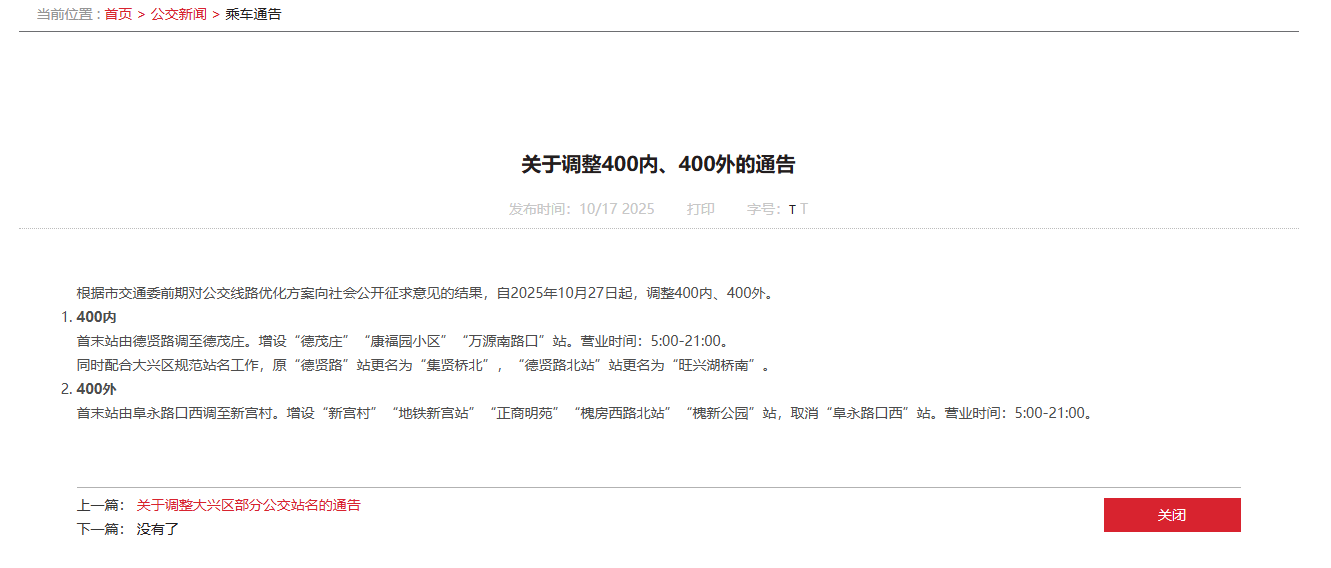根据市交通委前期对公交线路优化方案向社会公开征求意见的结果,自2025年10月27日起,调整400内、400外。
