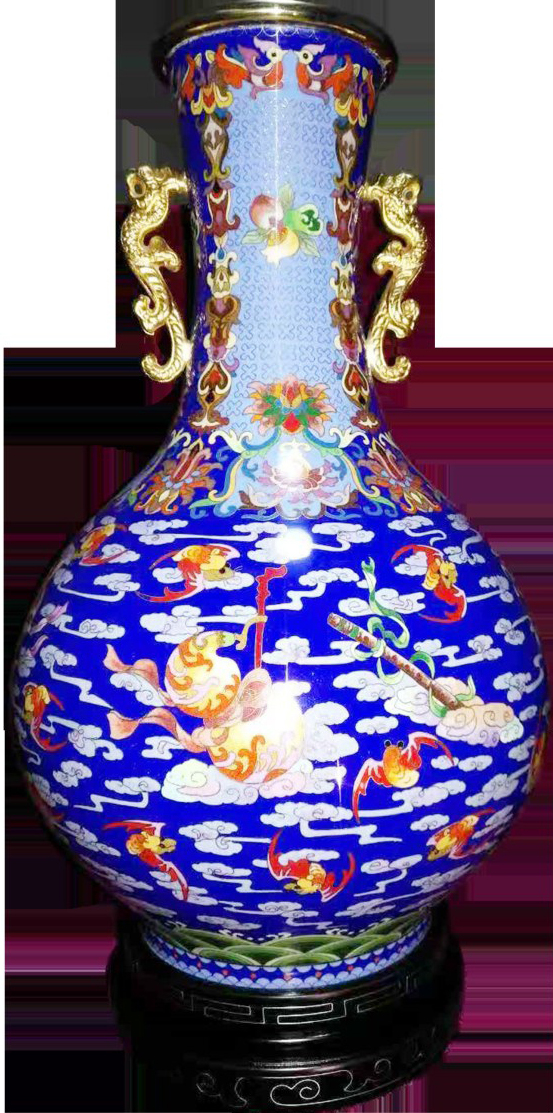 此外,群仙赐福瓶也以精美繁杂的纹饰让人眼前一亮,该作品以我国民间喜闻乐见的暗八仙(八仙手中的法器)为主体纹样,寓意群仙祝寿。瓶颈装饰有福寿三多图案,佛手、桃子和石榴分别寓意多福、多寿、多子,瓶身上翱翔于祥云之间的红蝙蝠,取其“洪福”谐音,象征洪福齐天,寄托了国家祥和、人民顺遂的美好祝愿。现场还有不少精致典雅的珠宝首饰、造型逼真的动物摆件等景泰蓝工艺品展出。