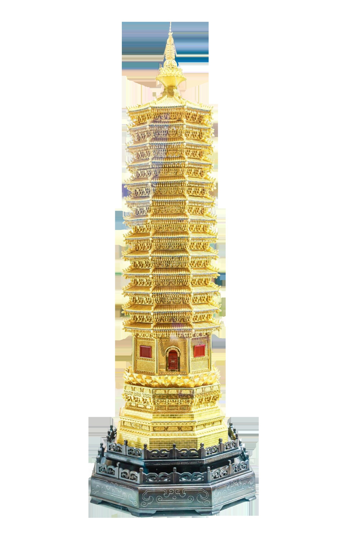 其中有一座通体由花丝镶嵌工艺制作而成的“燃灯塔”格外引人注目,目前摆放在北京大运河博物馆共享大厅一层。据花丝镶嵌制作技艺传承人张汝婕介绍,该作品以1∶40的比例真实再现燃灯塔,在结构和细节上都做到了对原塔的精准还原。花丝镶嵌燃灯塔高1.1米,由2000多个纯手工部件组成,历时22个月制作完成,整座宝塔金光熠熠。燃灯塔作为通州的标志性建筑,与花丝镶嵌技艺有着不解之缘。1958年,北京花丝镶嵌厂就成立于通州燃灯塔下,经过时代更迭,当年的老工艺厂已变成北京东方艺珍花丝镶嵌厂,虽已搬离原址,但仍在通州大运河畔伴随城市共同成长。