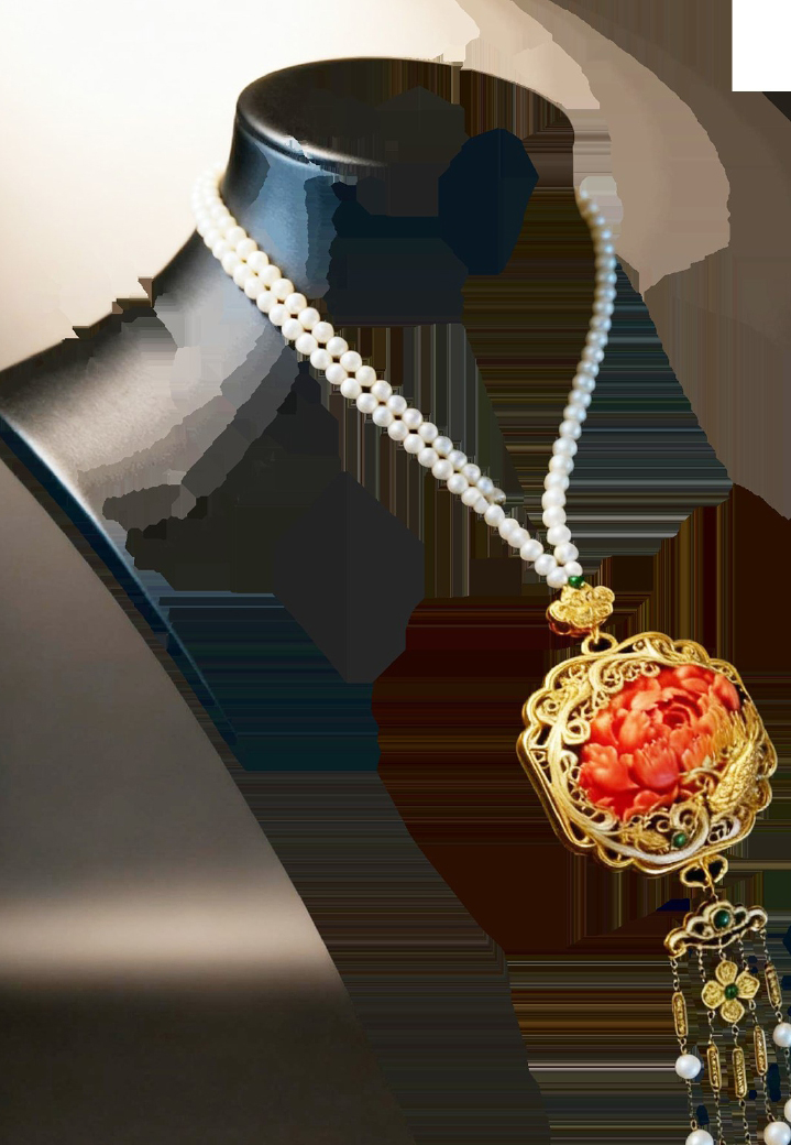 同在大运河博物馆展出的还有18K金花丝镶嵌凤穿牡丹吊坠项链,位于共享大厅地下一层。在金丝勾勒的凤凰图案中,一朵鲜艳的红牡丹宝石镶嵌其中,尽显工艺的繁杂与奢侈。凤穿牡丹是传统的吉祥图案,凤为百鸟之王,牡丹为百花之王,两者结合,象征安宁吉祥,富贵兴旺。此外,造型精美的花卉饰品、栩栩如生的葫芦摆件、精雕细琢的贝壳挂件等作品都将在北京国际非遗周上集中展出。