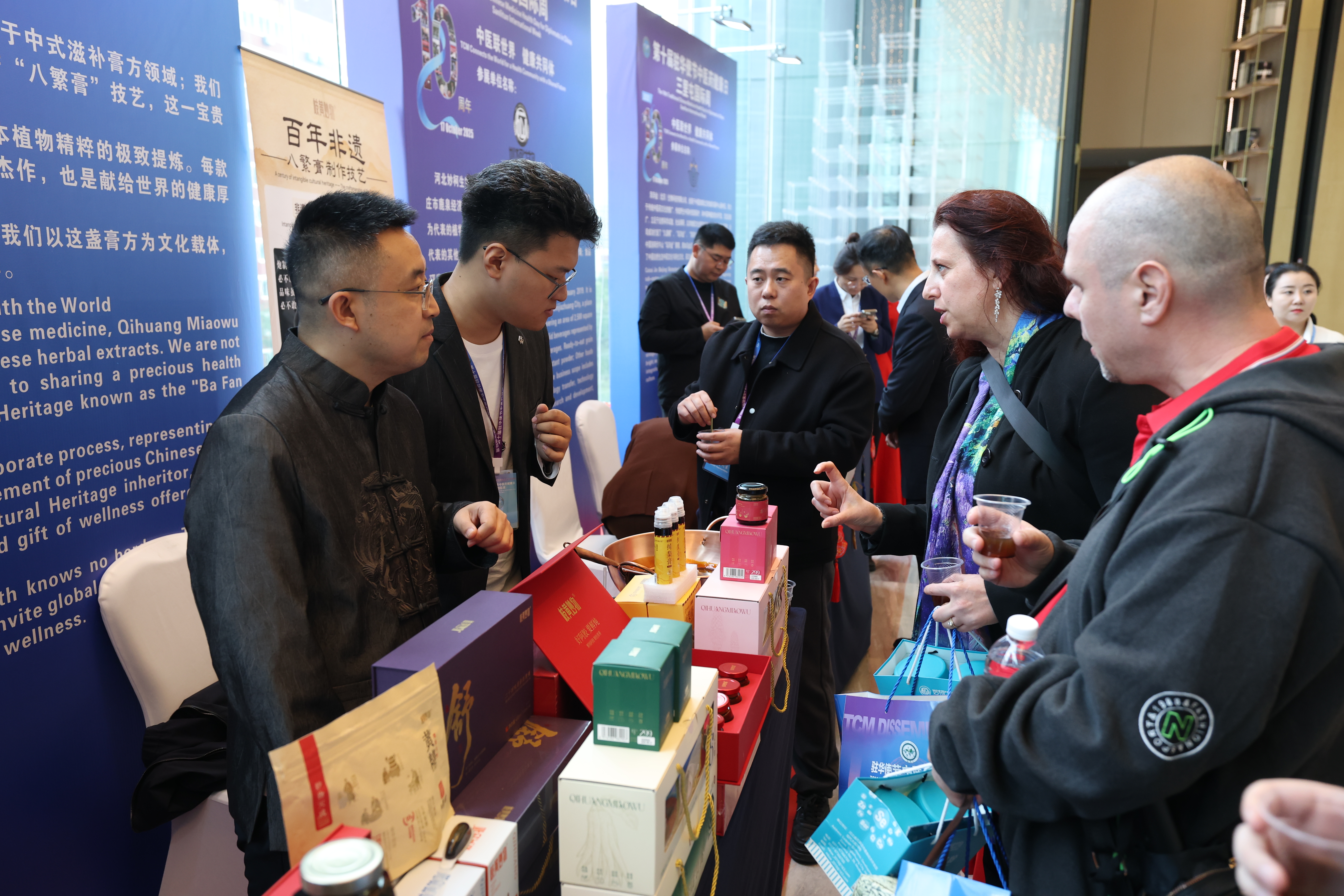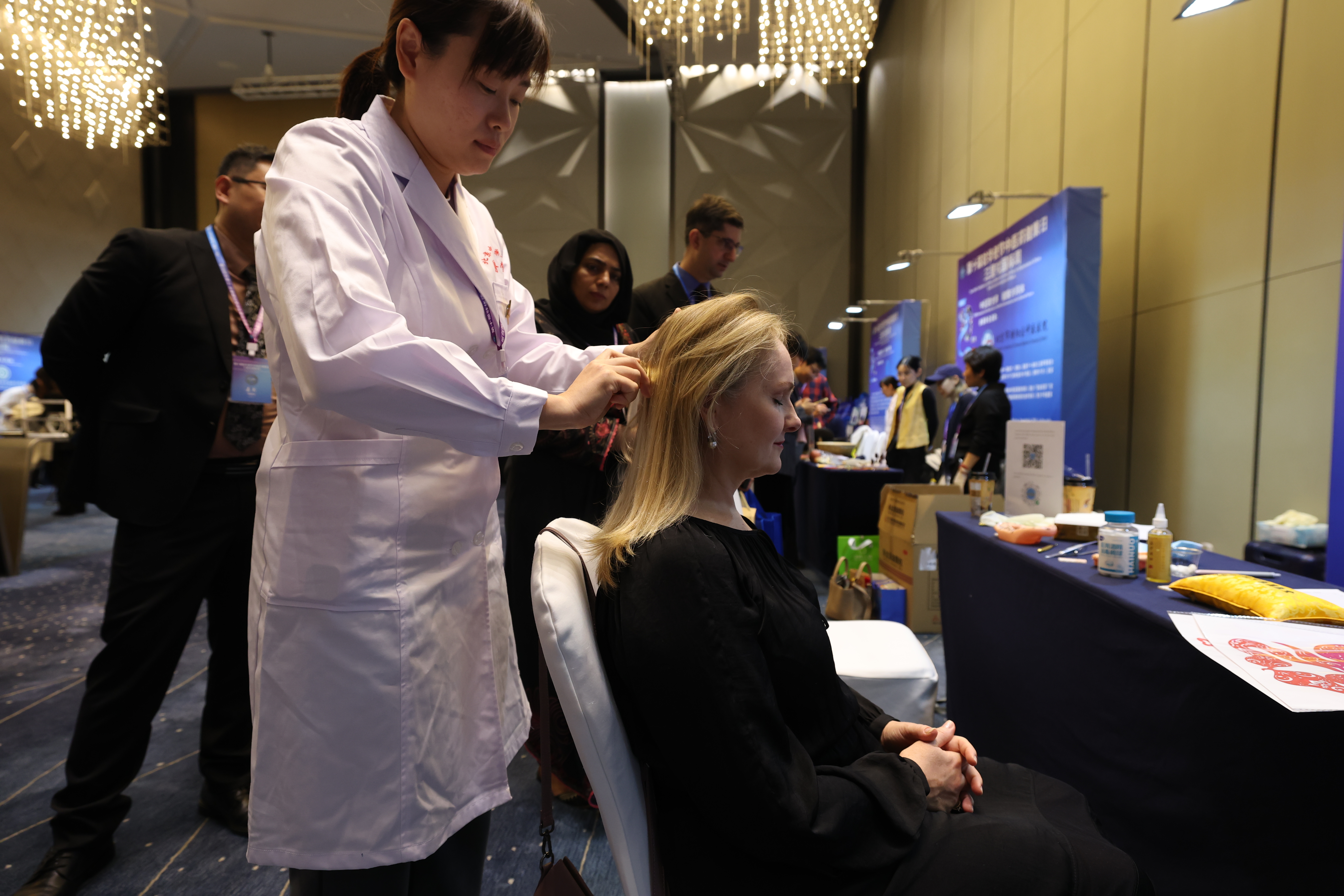 活动外场还设置了外交官中医药市集沙龙,外交官们沉浸式体验脉诊、耳穴贴压等中医特色项目,品尝中药咖啡、中药面包、中药奶茶、养生药膳等创新产品,在互动中深化对中医药文化的认知与认同。