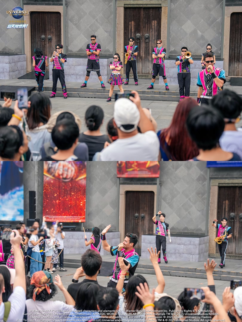 与乌镇戏剧节携手的第三年,北京环球度假区此次带来了更加多元的惊喜。特别装点的主题墙现场吸引大批游客驻足打卡,在视觉中感受一次来自七大主题景区的热烈氛围。首次亮相乌镇戏剧节的环球中场秀特别版,从前奏起便立刻成为全场焦点,铜管乐器与嘻哈节奏相融合的基调点燃街头,舞者、啦啦队与说唱歌手同台演绎,在古镇舞台上释放出蓬勃的潮流能量。演出更结合现场氛围与观众展开即兴互动,被节奏感召的游客们纷纷加入共舞,实现从旁观者到舞台主角的华丽变身。