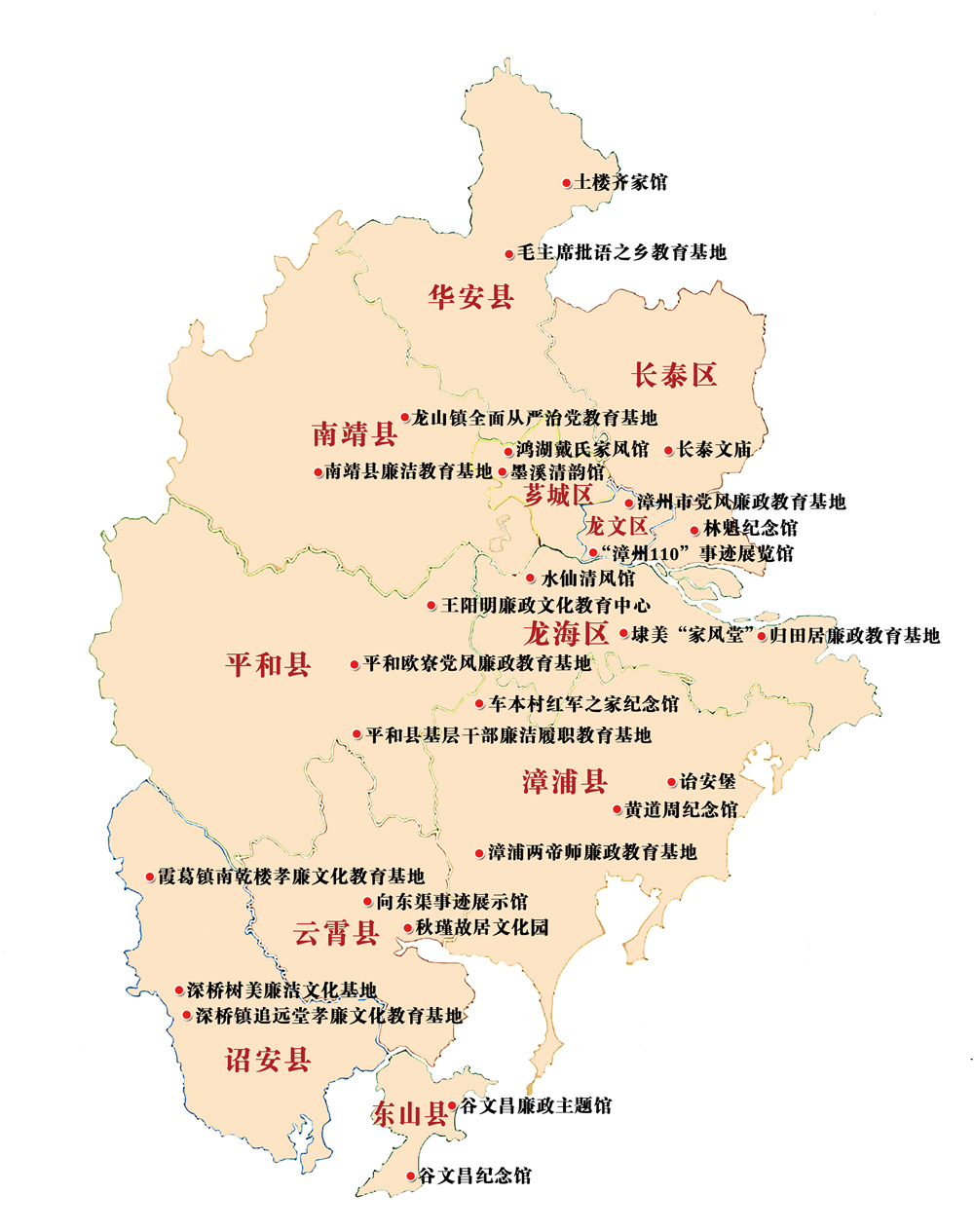 图②:漳州市主要廉洁教育场所分布示意图。漳州市纪委监委供图