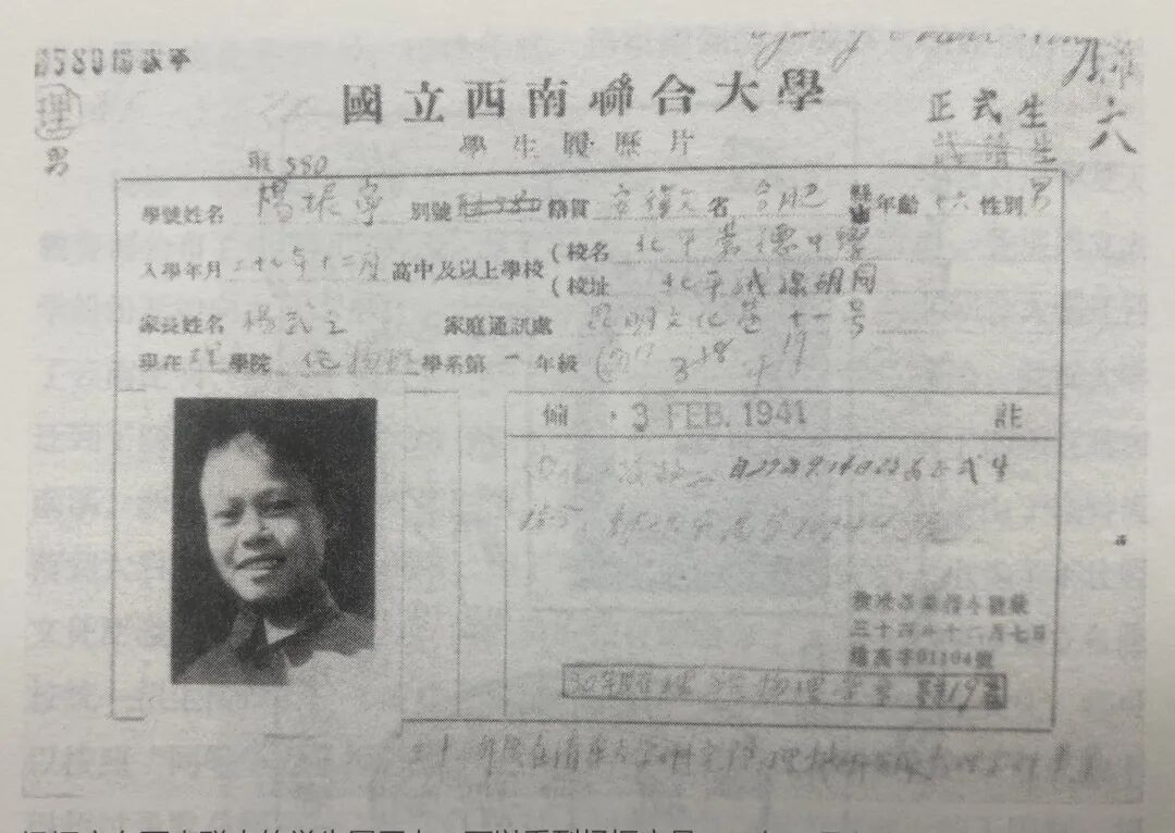 杨振宁在西南联大的学生履历卡。可以看到杨振宁是1938年12月入学,由化学系转到物理系。