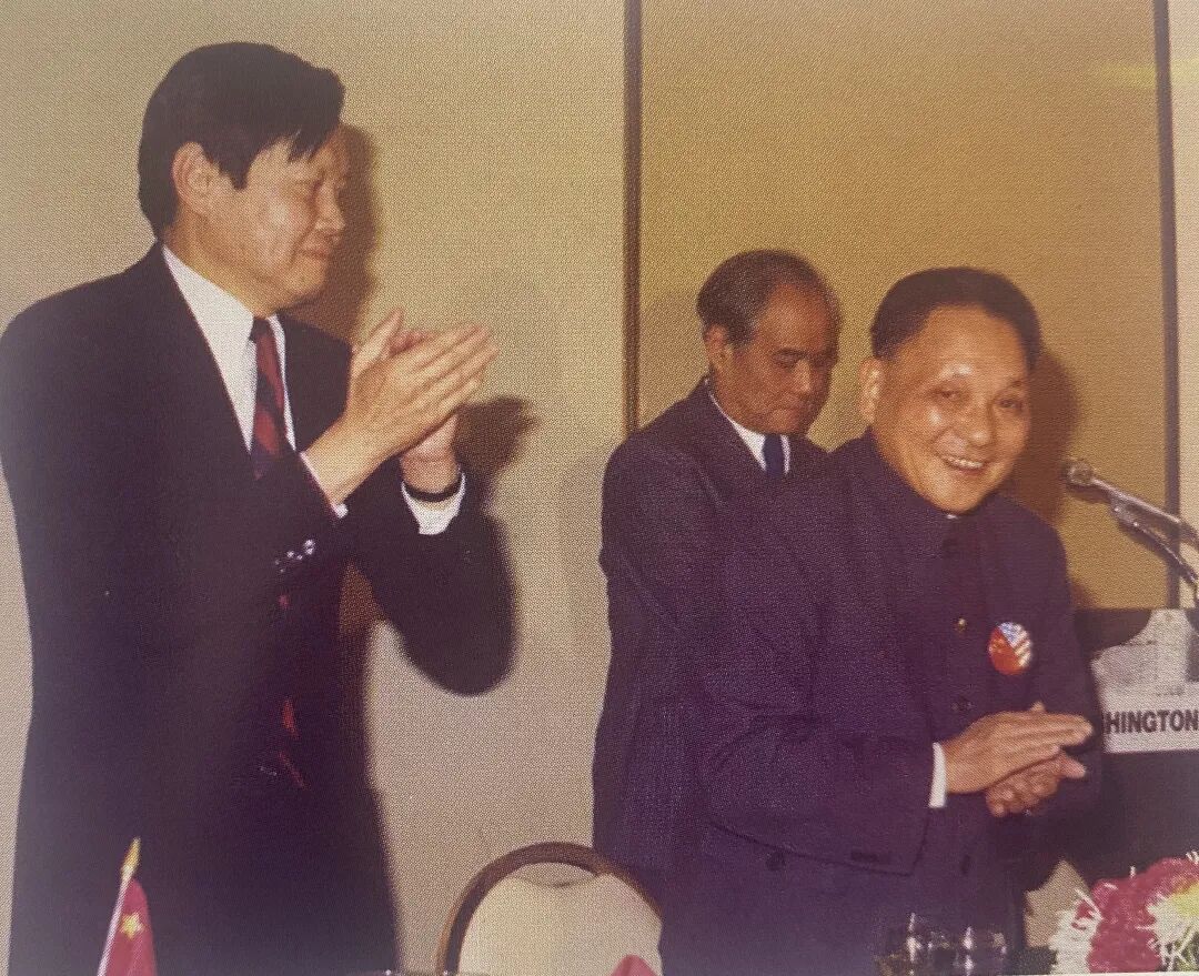 1979年元旦,中美正式建交,邓小平随即访美,当时担任全美华人协会会长的杨振宁在欢迎仪式上发表了致辞。左起:杨振宁、何炳棣、邓小平,1979年1月30日摄于华盛顿。