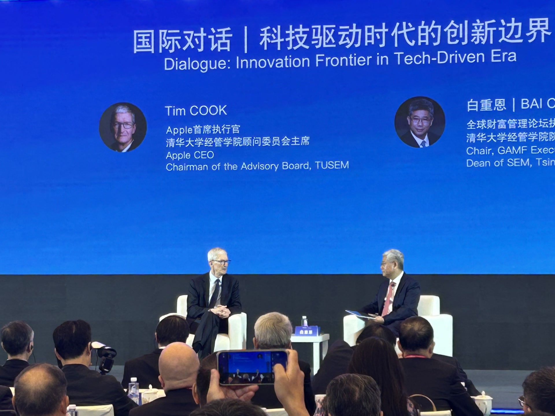 以“世界变革下的未来之路”为主题的全球财富管理论坛·2025上海苏河湾大会18日上午举行。苹果公司首席执行官蒂姆·库克与全球财富管理论坛执委会主席、清华大学经管学院院长白重恩进行对话。