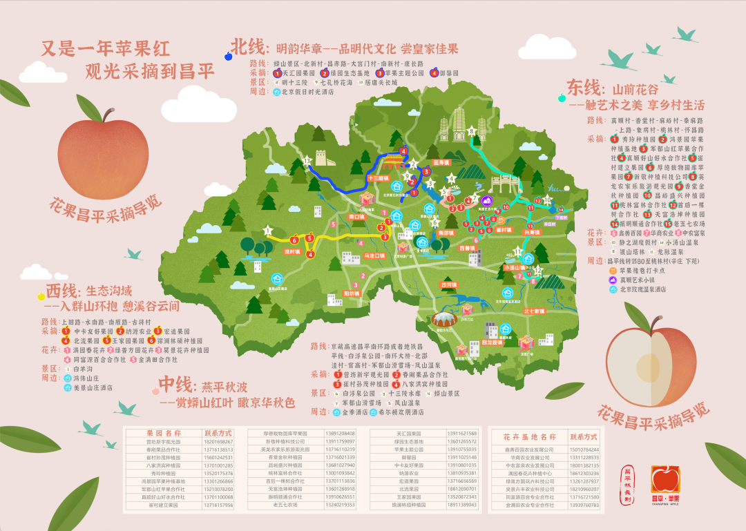 为方便市民采摘出行,昌平区推出了“花果昌平采摘导览图”,共设置有4条特色观光采摘路线,串联起昌平的山水人文,为市民带来别样的京北周末风情。