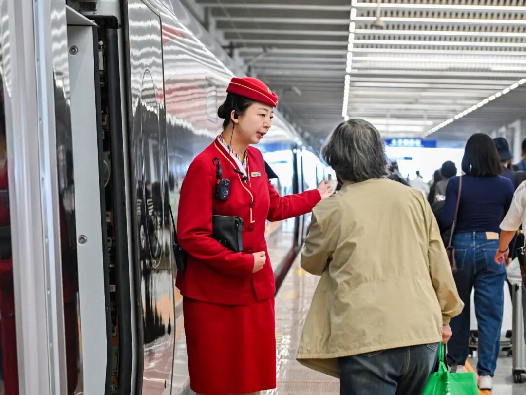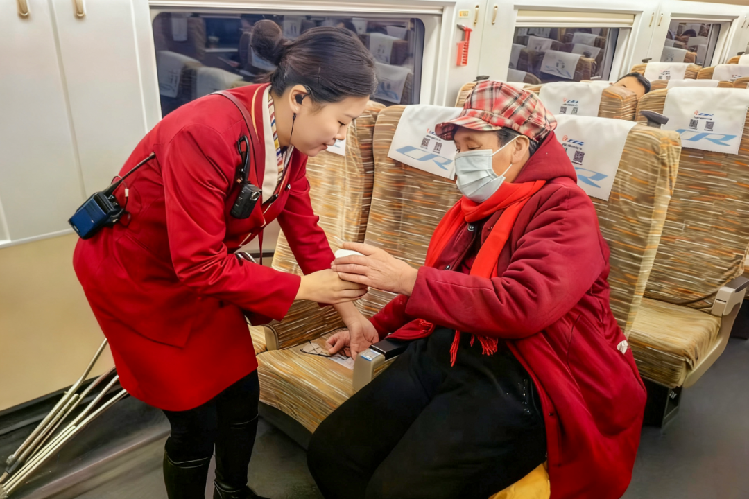 列车长师雅静对前来问询的一位银发旅客说