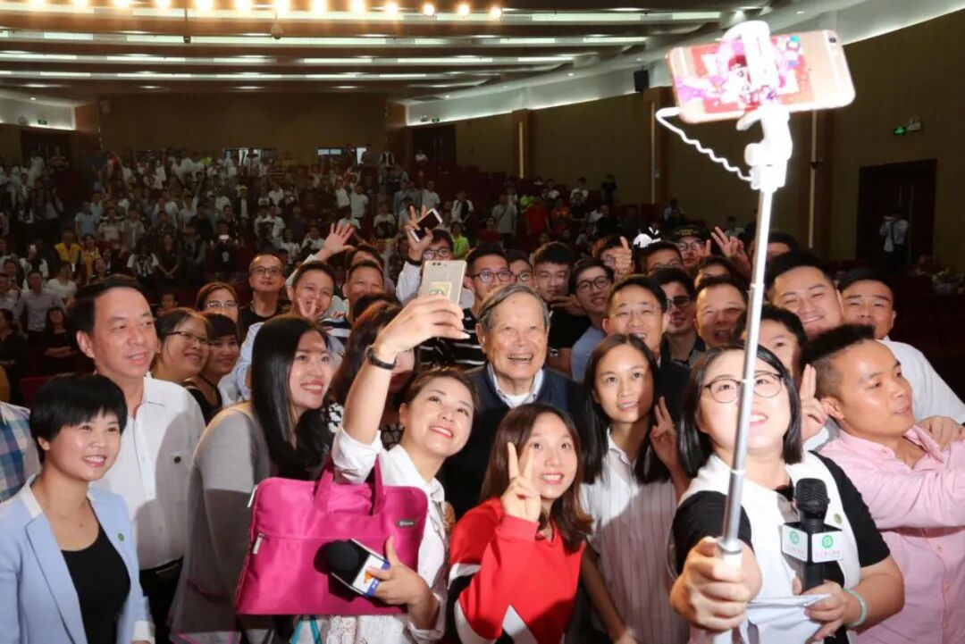 2017年4月,杨振宁与东莞理工学院校友合影。 图片来源:东莞理工学院