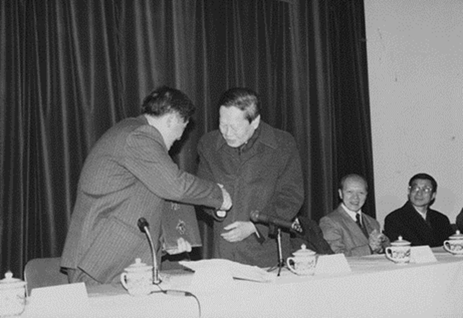 ▲ 1994年1月,杨振宁(左二)受聘为中国科大理学院名誉院长