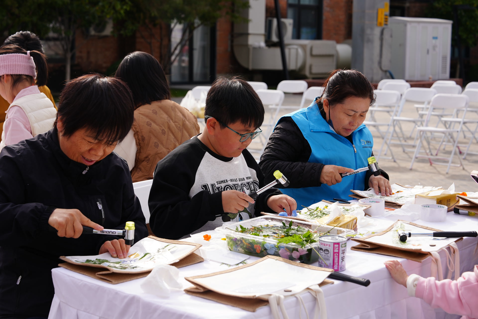 在清华美育课堂区,来自清华美院的学子带着社区的大朋友小朋友一起研习传统技艺——植物拓染,敲敲打打间,用天然的植物叶片在帆布包上小心翼翼地拓染,制作出独属包包。