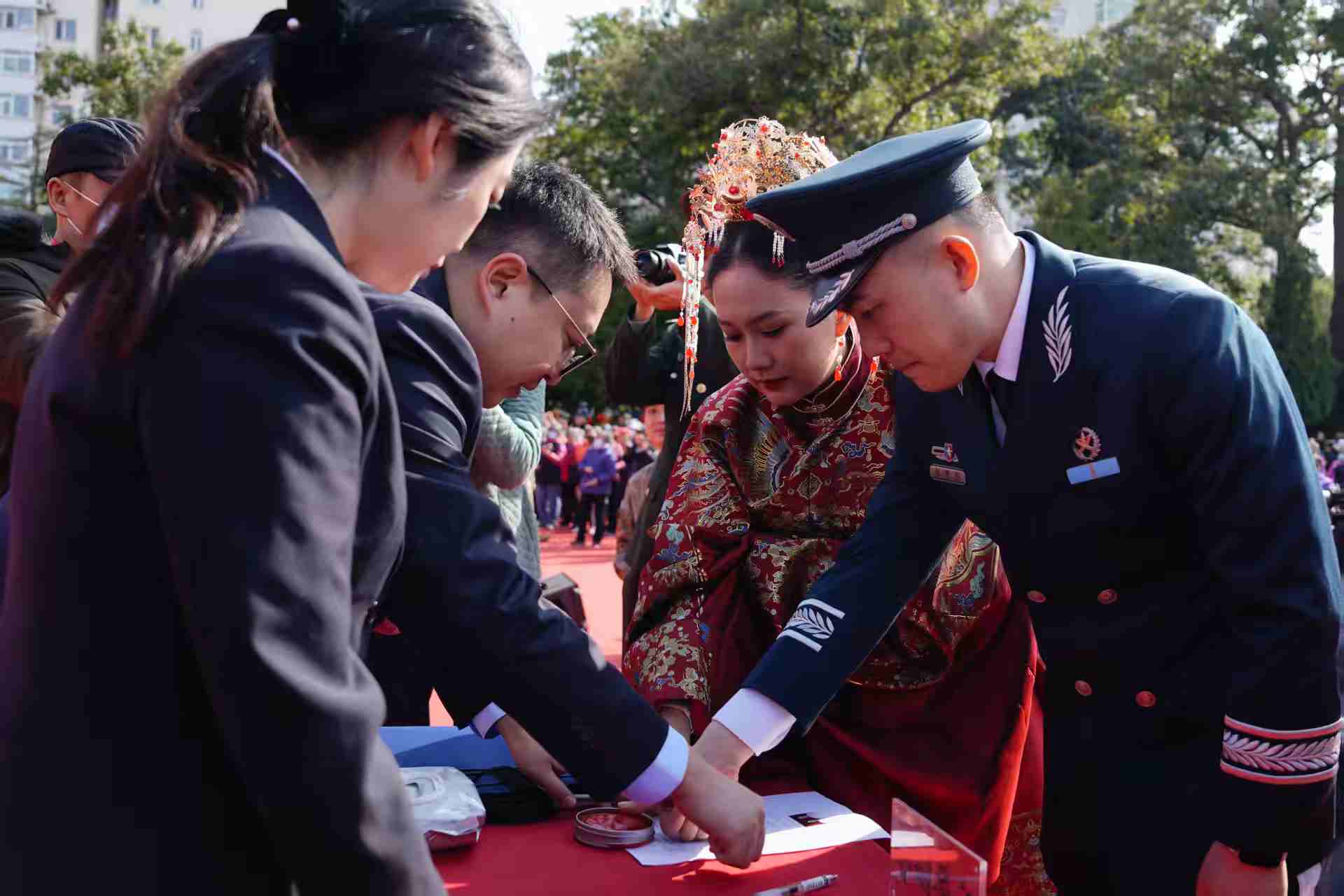 仪式现场还上演暖心一幕:海淀区民政局婚登处工作人员为3对新人代表现场办理结婚证,让“服务送军营”落到实处。