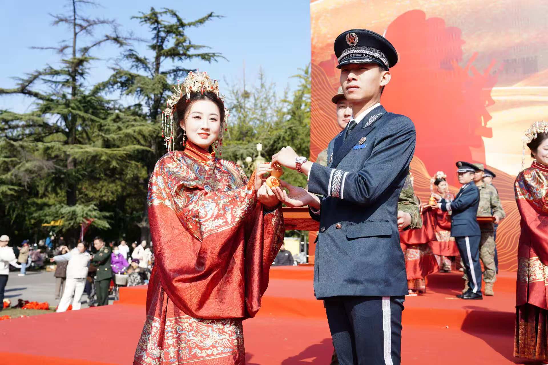 仪式中,传统礼俗与军人特质巧妙融合:新娘将团扇交予新郎,以“却扇纳祥”开启新生活;“三拜之礼”更具深意——一拜天地感恩祖国无恙,二拜高堂致谢父母养育与部队培养,夫妻对拜许下相守诺言;新人共同加盖喜印于婚书、共饮合卺酒,以传统礼仪定格忠诚与浪漫;四手相牵跟读誓言时,铿锵的承诺里满是军地家庭的责任与担当。